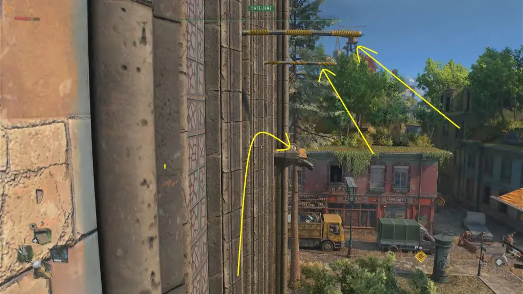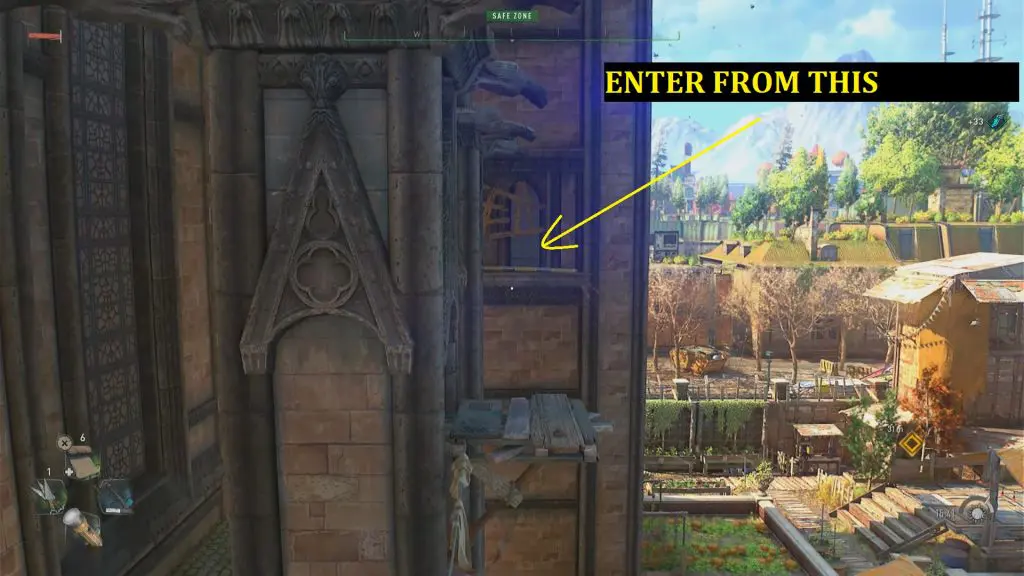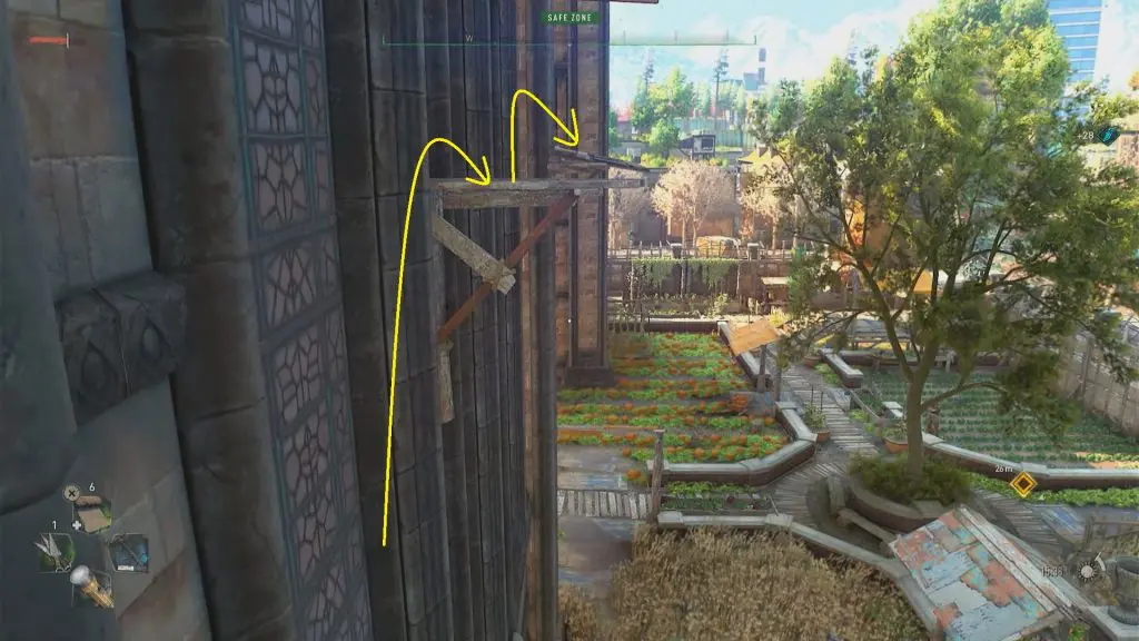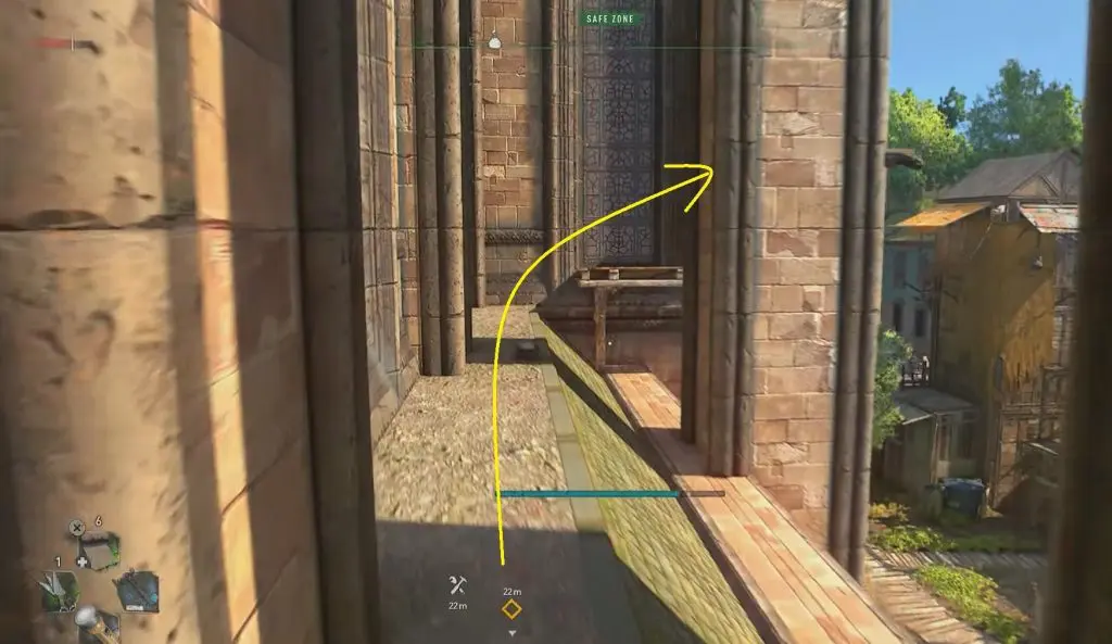 Begin your journey at the southwest corner of the church. Begin your ascent from the church doors. Walk up the planks near the church doors, then jump to the horizontal monkey bar, then up the planks to the church’s side. Refer below set of images to reach the desired location.