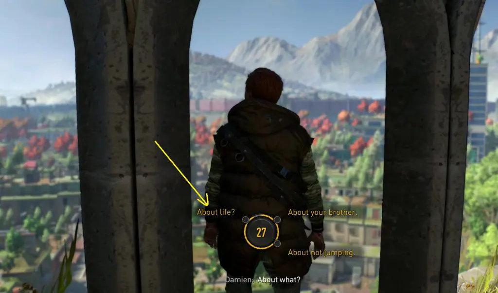 At this point, if you talk to Damien about life and then interrupt him, he won’t jump off. Any other combination and he will jump. So talk about life and try to make him realize the error of his ways.