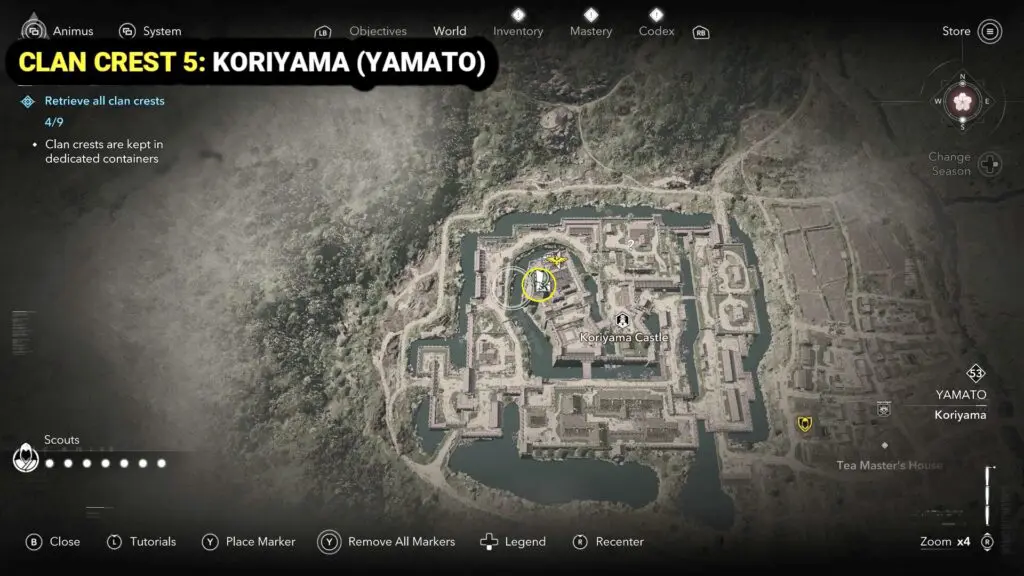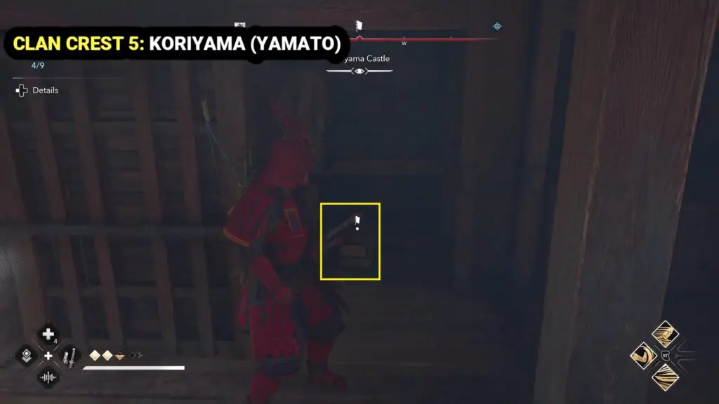 To find this crest, head to Koriyama in the northwest part of Yamato. The crest is located on the main tower of Koriyama Castle.