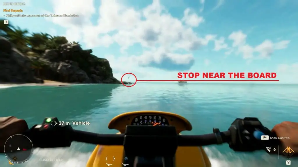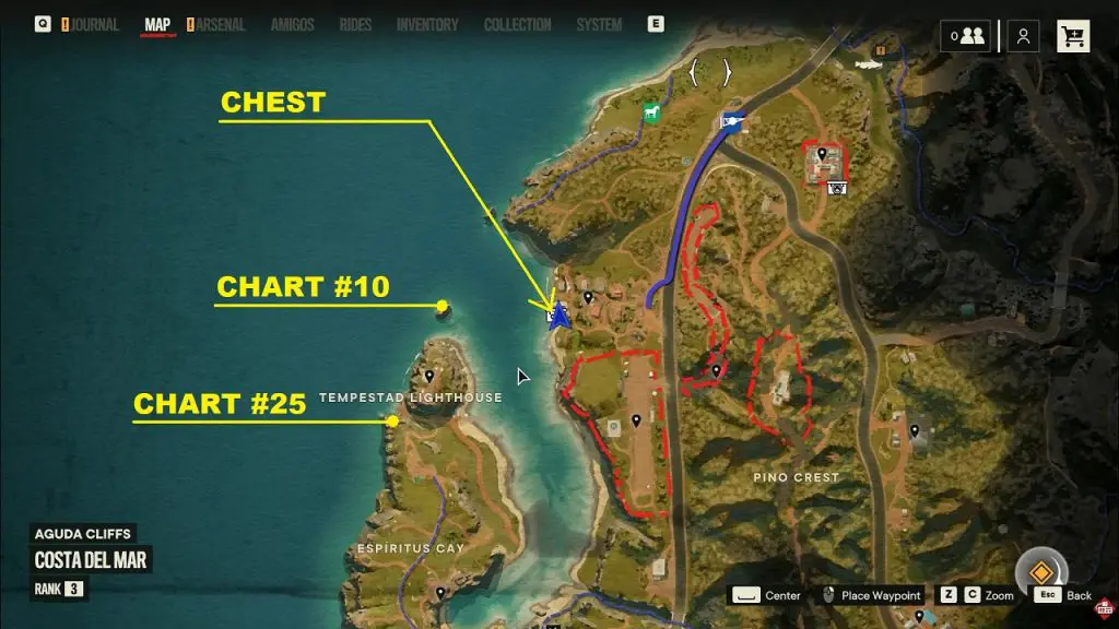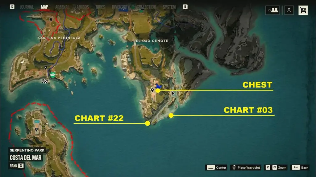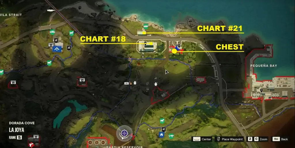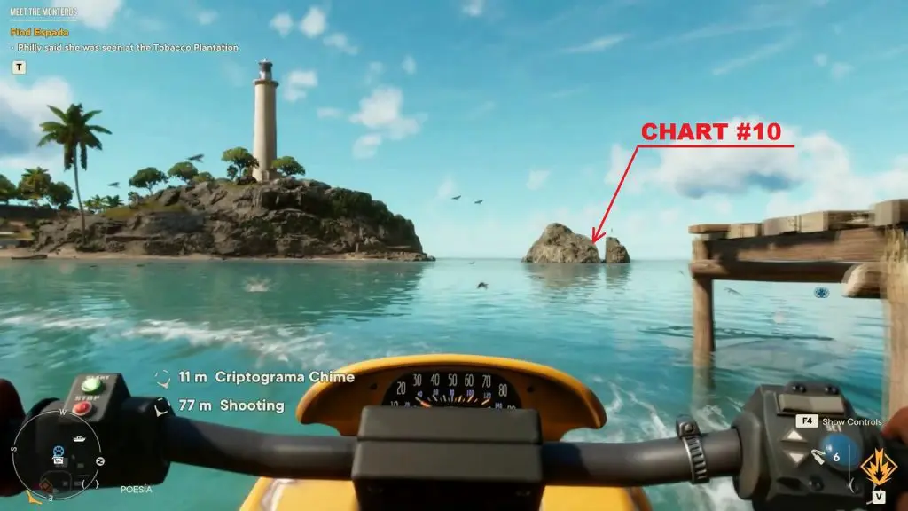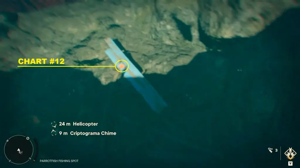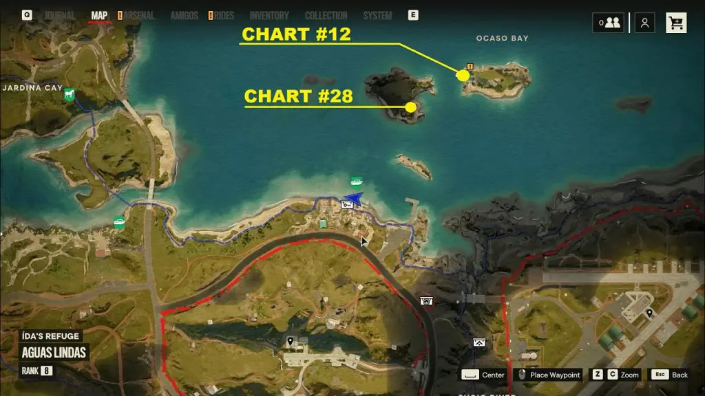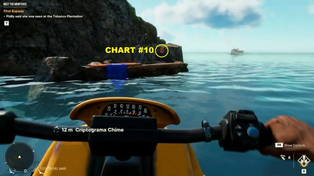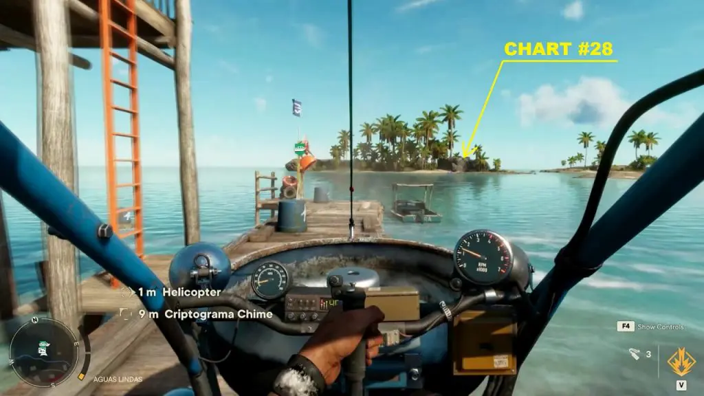 Criptograma Chart #28: The first chart is on the island north of the chest location as shown below. Use the dockside pickup point to spawn a vehicle and go to the northern island to get the chart.