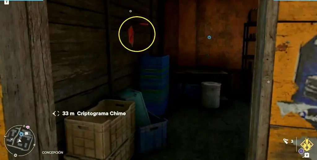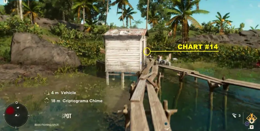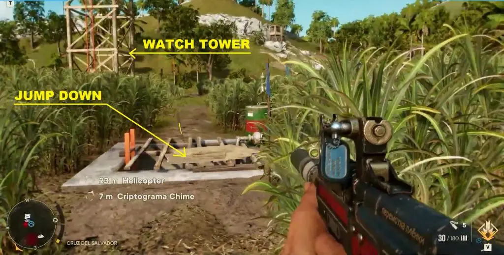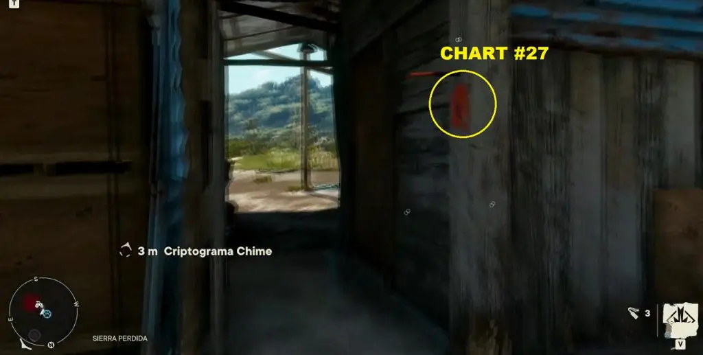 Criptograma Chart #13: The chart is inside a hole in the ground very close to the watchtower as shown below. Destroy the wooden covering on the hole then jump inside to get the chart.