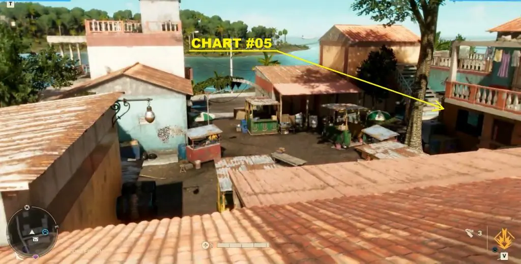 Criptograma Chart #05: From the chest location, jump on the roof on the north side. Then jump down into the courtyard. The chart is inside the room in front of the staircase as shown below.