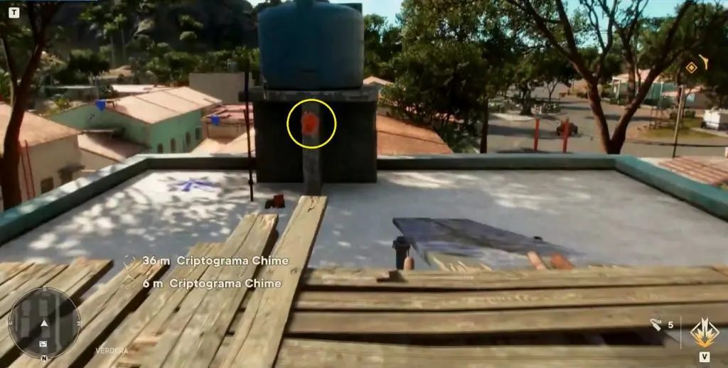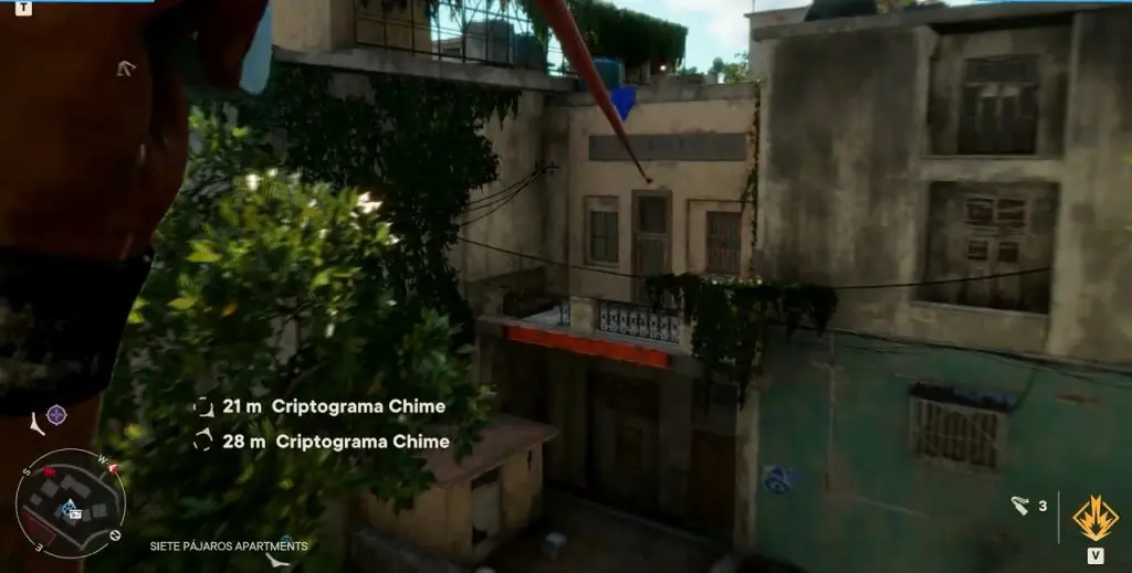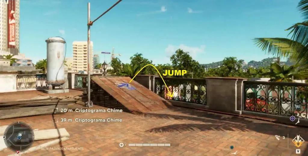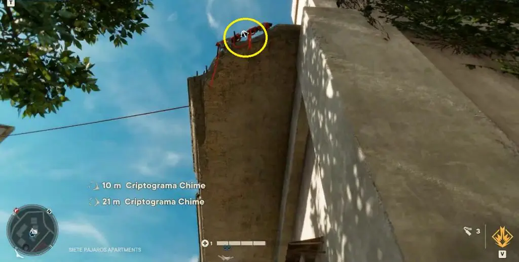 Criptograma Chart #15: On the right side of the chart you will see a zipline. Use the zipline to reach the building on the west side as shown below. Climb the vines here, to reach the rooftop. Here you will find chart #15.