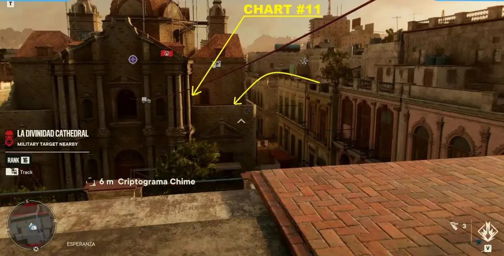 Criptograma Chart #11: This chart is on the balcony of the cathedral. To reach there, Jump on the roof at the right side of the chest and then continue south on the roof. Then jump from the ramp to reach the cathedral balcony as shown below.
