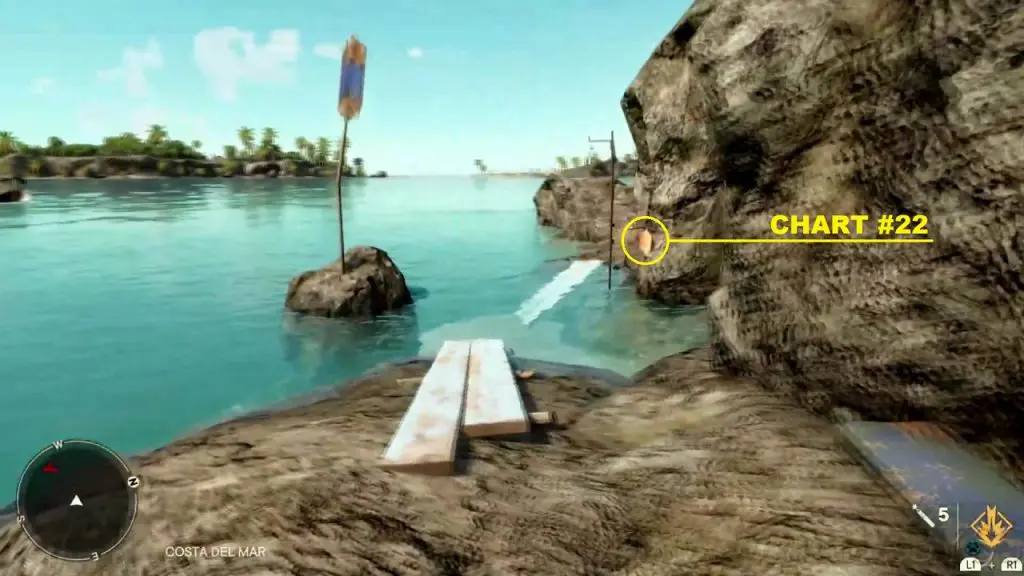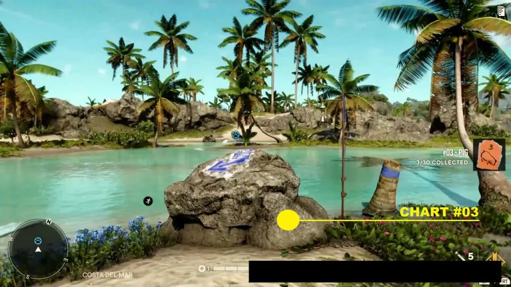 Criptograma Chart #03: From the chest, take the path southeast as shown below. This will lead you to a small landmass on water, with the chart on a rock as shown below.