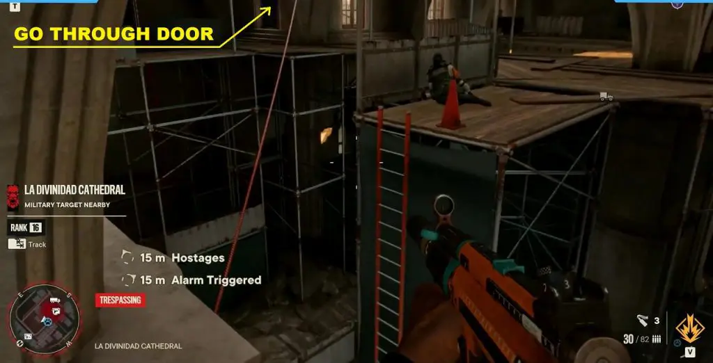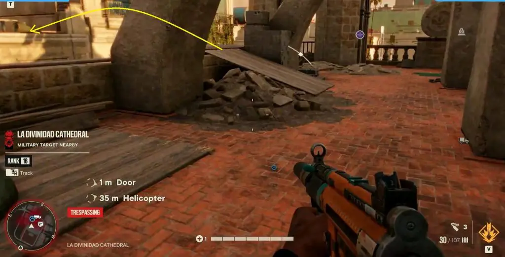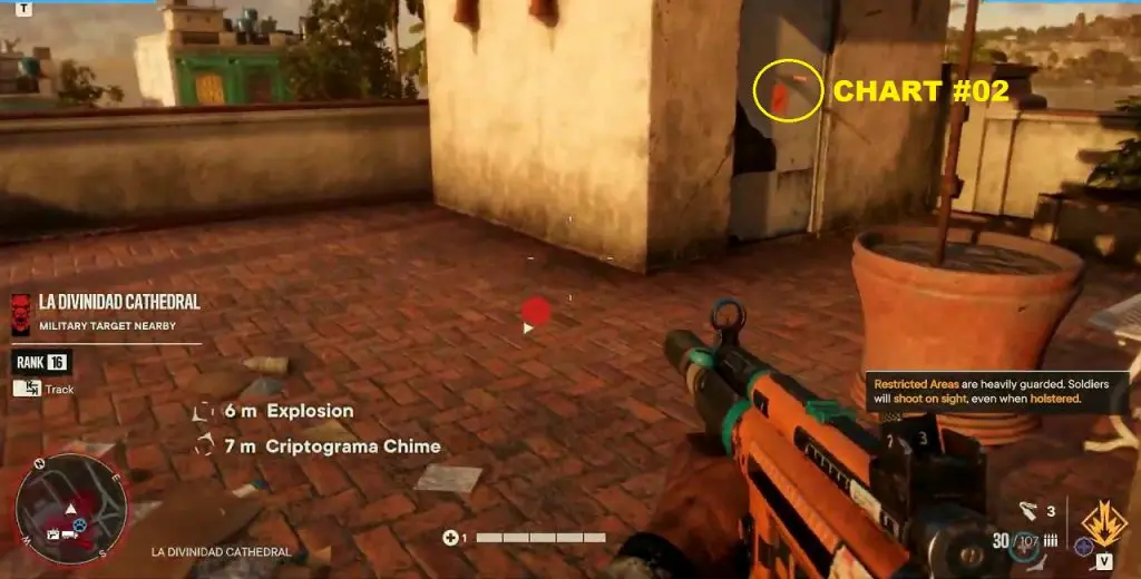 Criptograma Chart #02: Enter the cathedral through the door on the balcony where you got the previous chart. Exit the cathedral from the door on the east side of the same floor as shown below. Here you will see a ramp. Use the ramp to jump to the roof of the building further east. On this roof, you will find the chart.