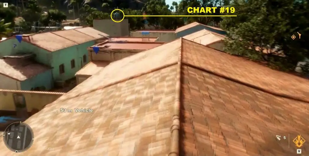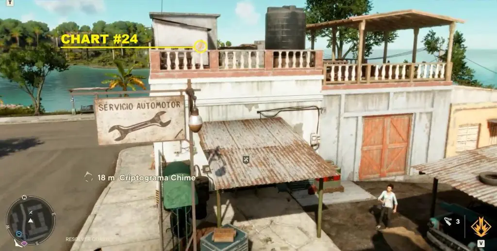 Criptograma Chart #24: This chart is on the top of the roof at the northeastern edge of Concepción. From the previous chart, climb up the staircase to reach the roof. Then use the zipline to reach the building on the east side. The chart is on the roof of the building on the north side as shown below.