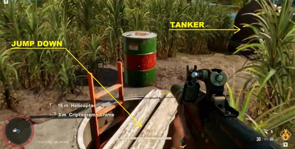 Criptograma Chart #19: This chart is also inside a hole in the ground very close to the watchtower. This hole is near an oil tanker as shown below. Destroy the wooden covering on the hole then jump inside to get the chart.