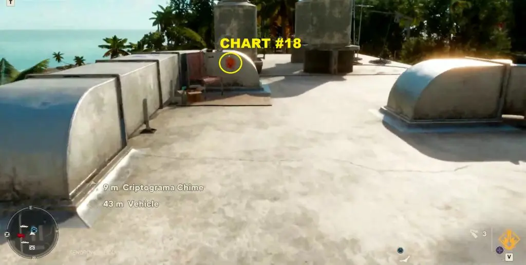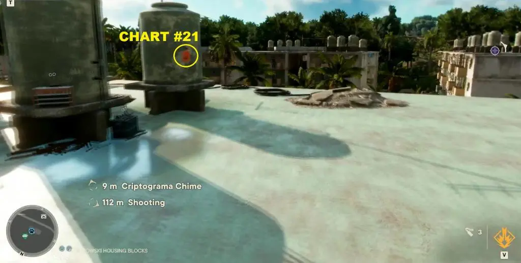 Criptograma Chart #21: The chart is on the rooftop of the building near the beach as shown below. You can climb to the rooftop using the scaffolding on the north side of the building.