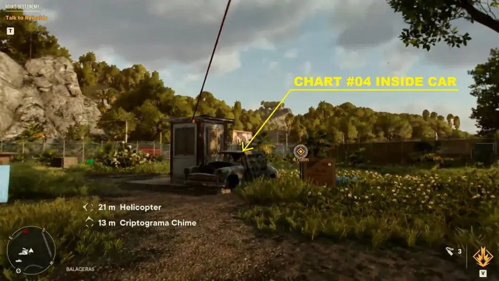 Criptograma Chart #04: Go further south and you will find the chart inside a destroyed car as shown below. Destroy the wooden pallets blocking the car to get the chart.