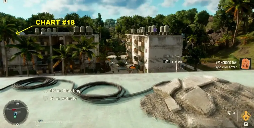 Criptograma Chart #18: After you have got the previous chart, look south and chart #18 is at the top of the building shown below. Jump down and go to the center of the apartment complex. Use the grapple to reach the roof of the building next to the building with chart #18. From there, use the zipline to reach the roof with Chart #18.