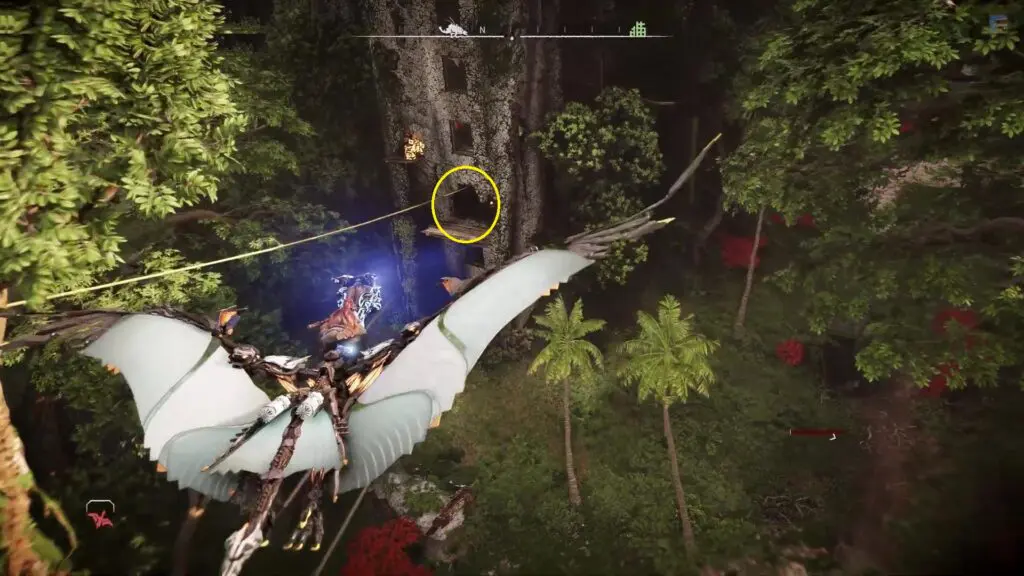 Utilize the zipline to reach the wooden platform. Then, shoot the fire pot above you to blow a hole in the ceiling of the small room beside you. Climb to the uppermost floor to discover the trinket.