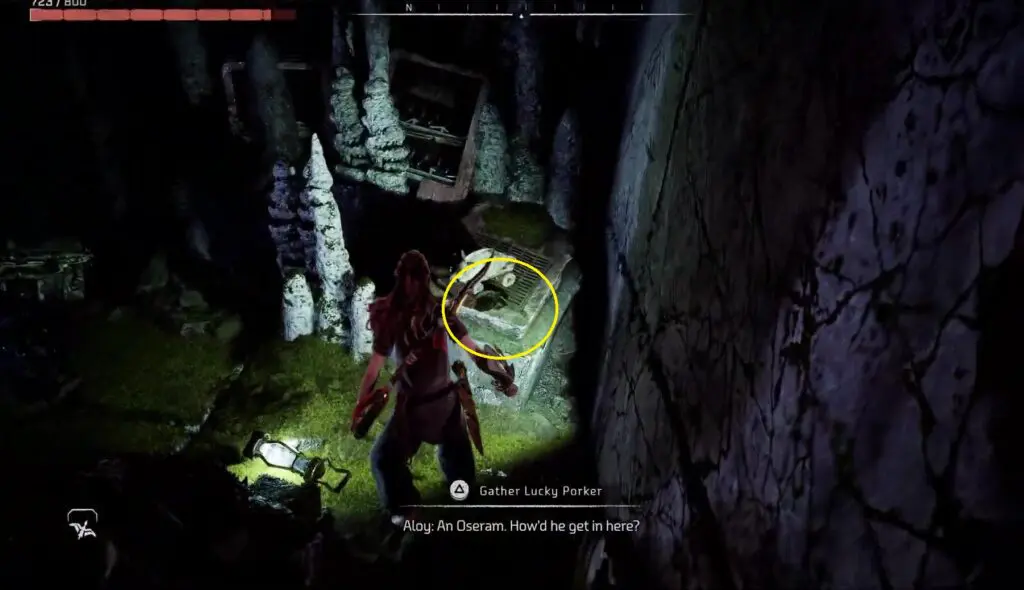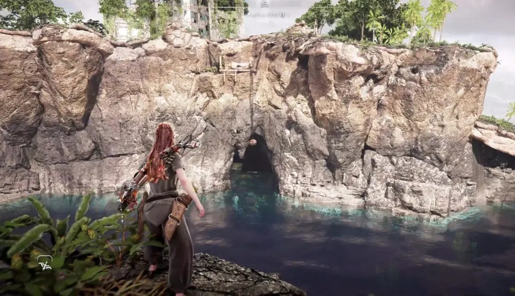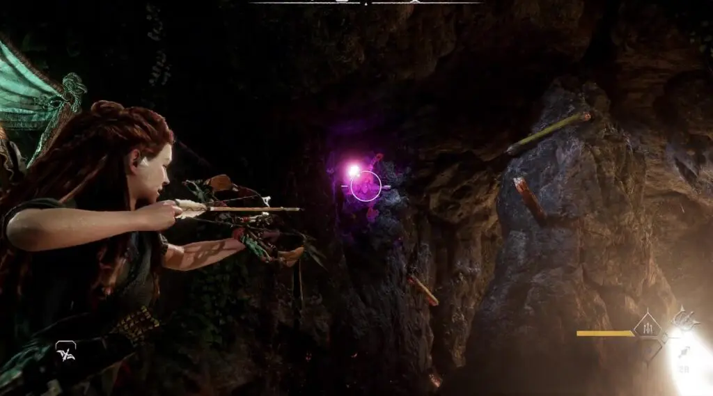 Once inside get out of the water look up and destroy the crystals to reveal holding points. Then, employ the grappling hook to retrieve the box that is submerged in the water and bring it outside the cave.