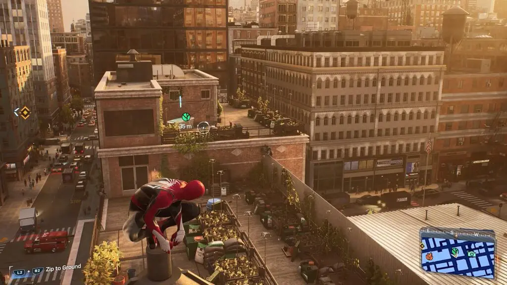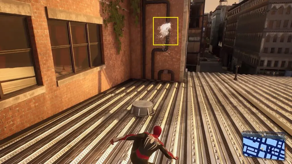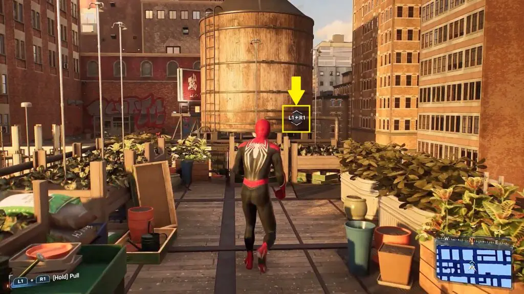 Your next objective will be to prep F.E.A.S.T Garden. Go to the water tank and press L1+R1 to pull the valve and get the water flowing. Now follow the pipe and fix the leaks by firing webs (Hold L2 + Press R1). Six leaks are inside the garden and are very easy to spot. The final leak is outside on the west side as shown in the second picture below. Fixing all the leaks completes the experiment.
