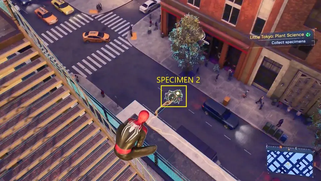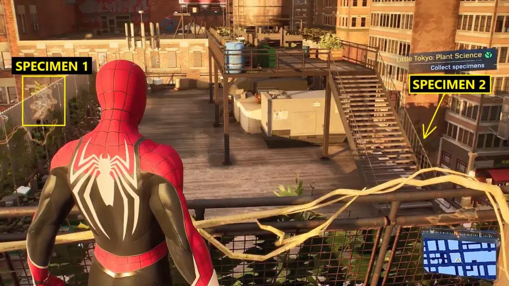 Scan by pressing the right joystick (R3) to see the vines in orange color. Then follow the vines to collect three specimens. One specimen is on the west side of the building, one on the east and one on the south side of the building as shown in the pictures below.