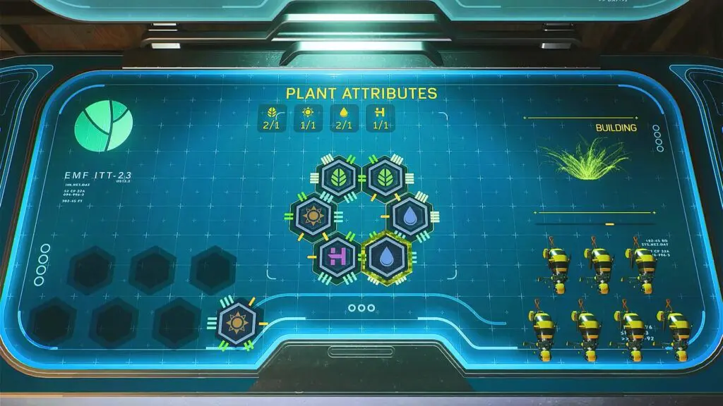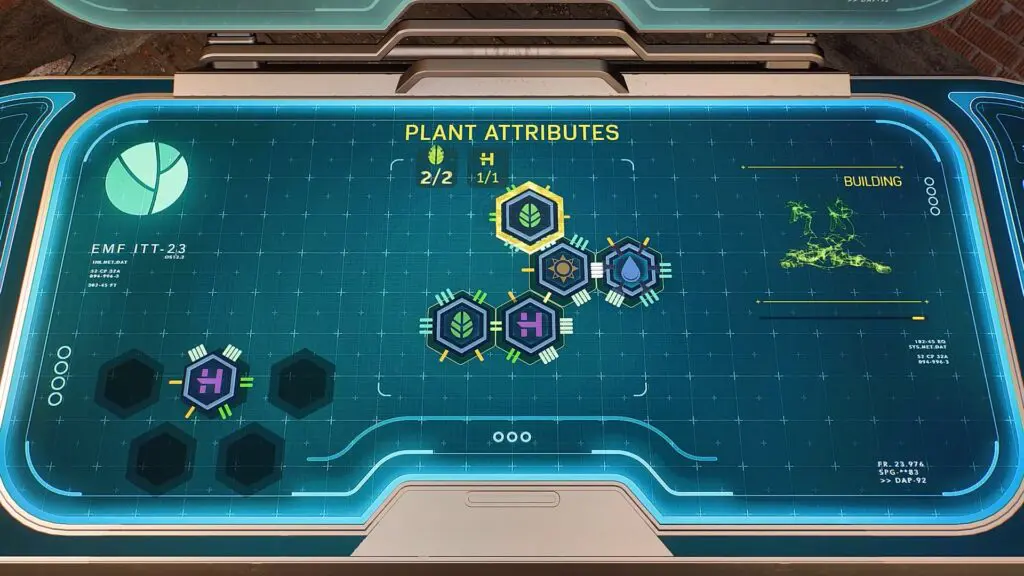 After collecting the specimens, go back to the terminal and solve the Plant Attributes puzzle. To solve the puzzle, you need to place the Hex genes in the correct empty slot. Each side of a Hex Gene will have either 1,2,3, or 4 lines. Only the hex genes with the matching sides can be placed next to each other. For example, the side with two lines can only be attached to another Hex Gene’s side with two lines. The puzzle is randomly generated. The solution to the puzzle that I got is shown in the second picture below.