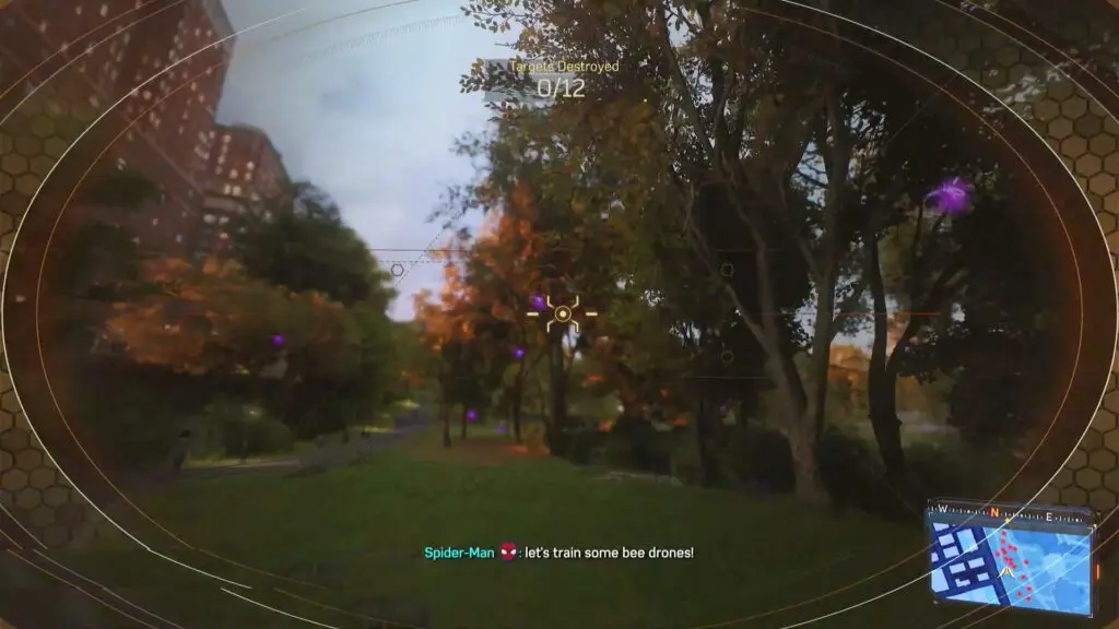 First, you must shoot 10 purple targets (rats). After that, you have to identify five places for bee nests, but in the middle of it, the drone is captured, and you lose the connection. Your next job is to find out where the bee drone is. Head to the spot marked in the park. At this point, you’ll see four nearby buildings marked. The right one is the third from the top, as shown on the map below.