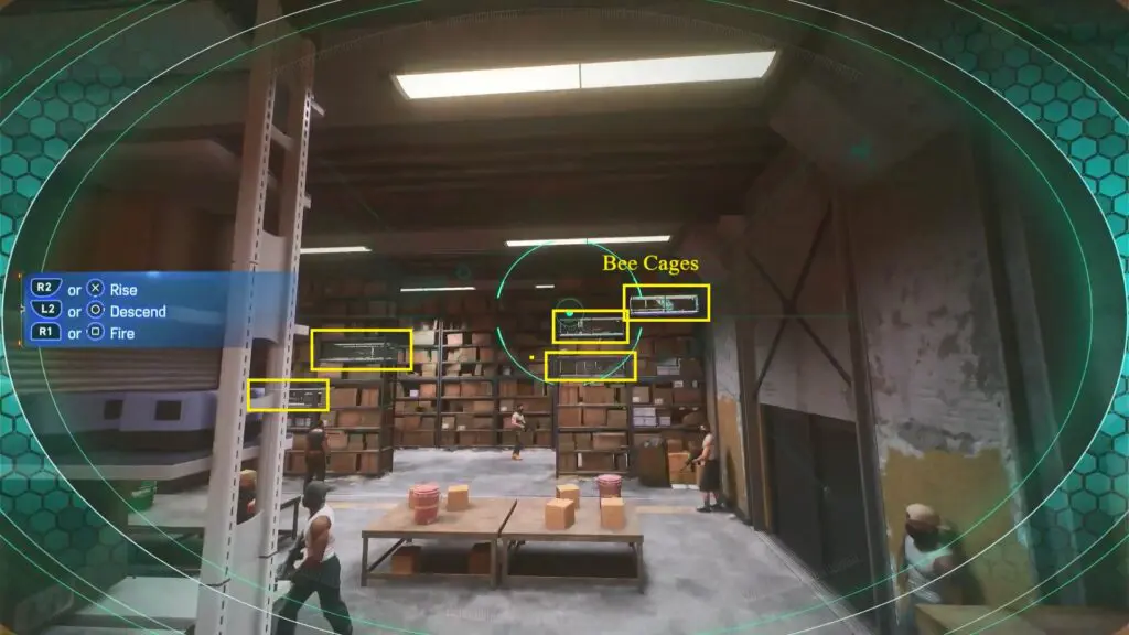 Go up to the rooftop and stand on the antenna to reconnect with the drone. Now, you’ll take control of the drone inside the room. Shoot the containers in the room to let the bees out, which will make the criminals open the door. Then, defeat all of them to finish this experiment.