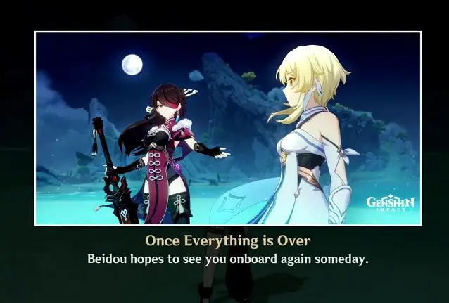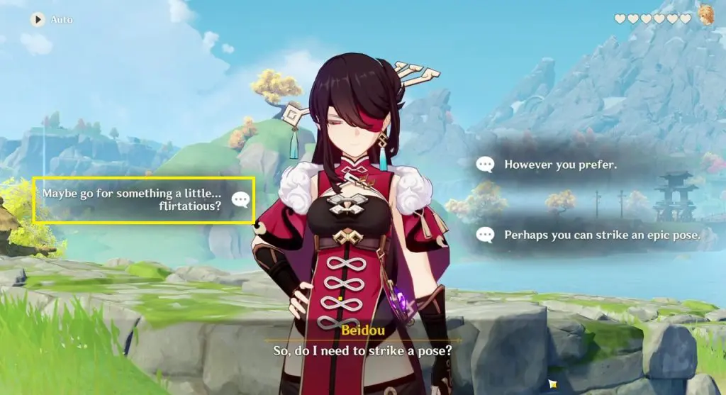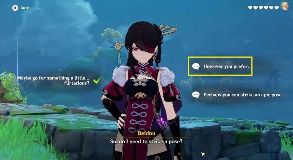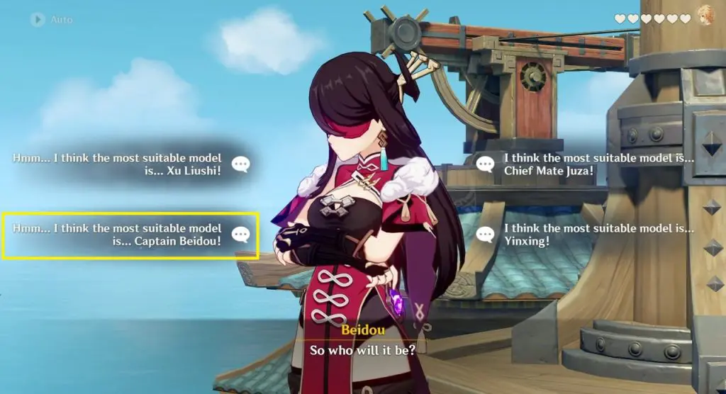 This time when Beidou asks how should she pose for the picture, select ‘However you Prefer‘ and take a picture of Beidou to unlock the third ending.
