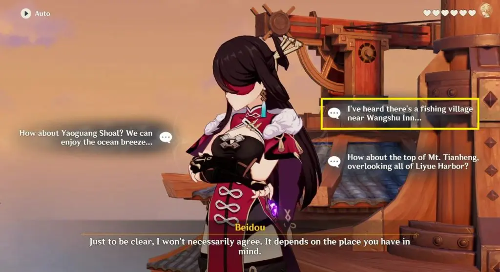 Continue the conversation and choose any dialogue option you want until you get the dialogue options shown in the picture below. Choose “I’ve heard there’s a fishing village near Wangshu Inn…“