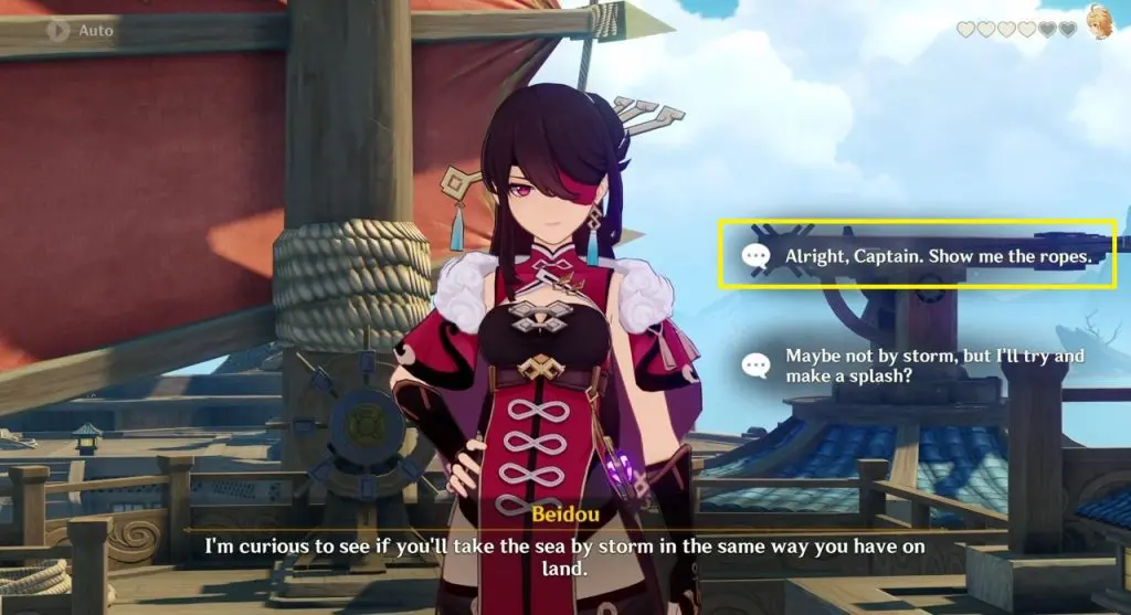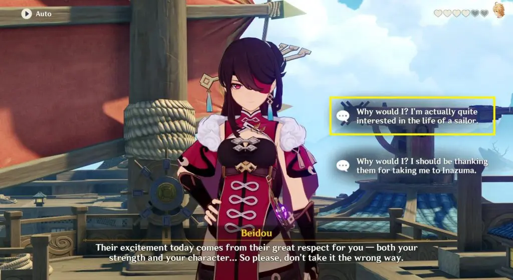 After a cutscene, you will talk to Beidou. here you will get several dialogue options. Choose anything you want until you get the chat options as shown in the picture below. Select “Why would I? I’m actually quite interested in the life of a sailor.”
