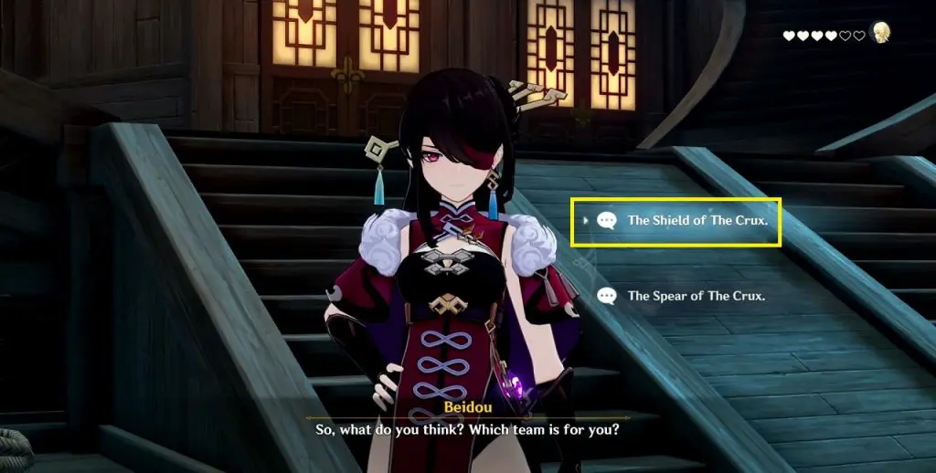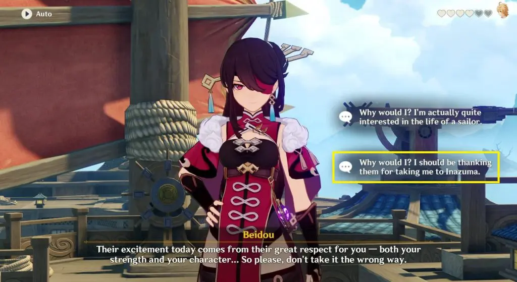 After a cutscene, you will talk to Beidou. here you will get several dialogue options. Choose anything you want until you get the chat options as shown in the picture below. Select “Why would I? I should be thanking them for taking me to Inazuma”