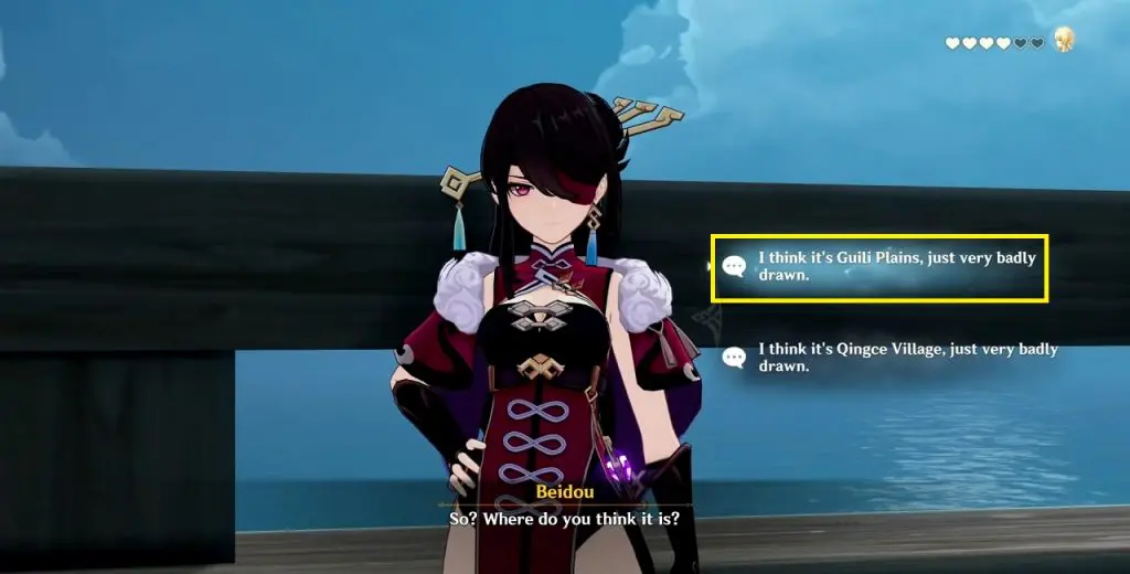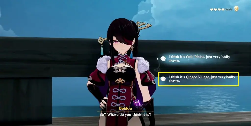 Beidou will ask you to come and talk to her in a quieter place. Go and talk to Beidou. She will give you a treasure map. When she asks, where do you think the treasure is, select: “I think it’s Guili Plains, just badly drawn.“