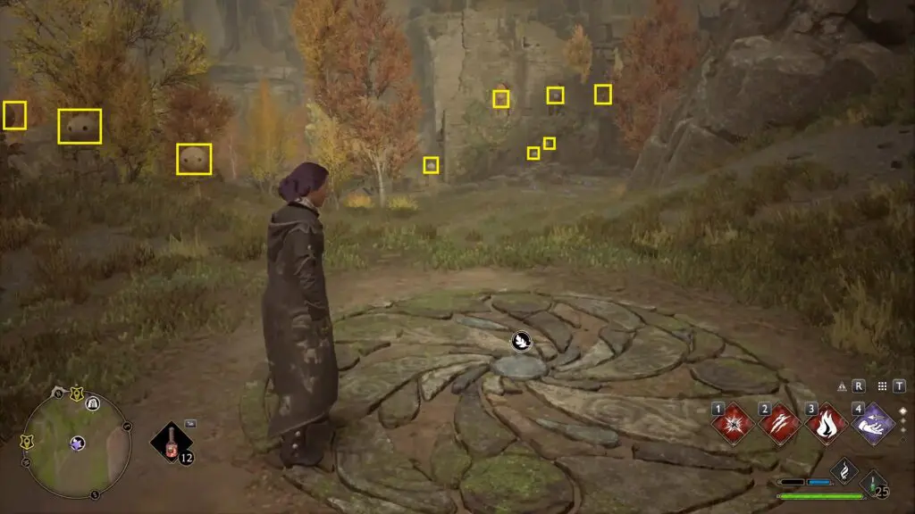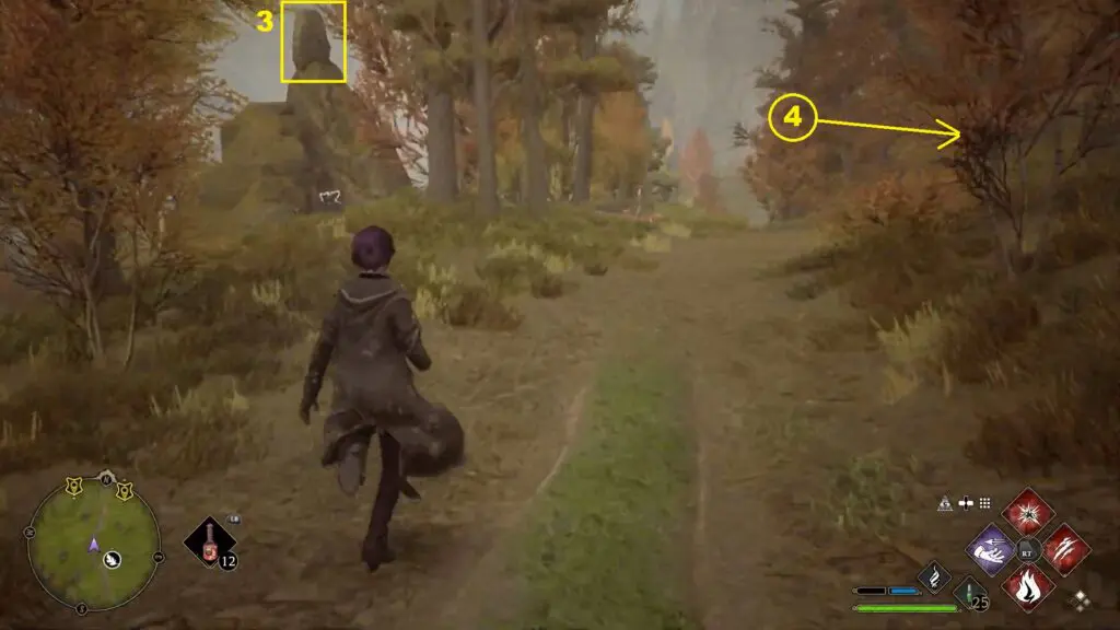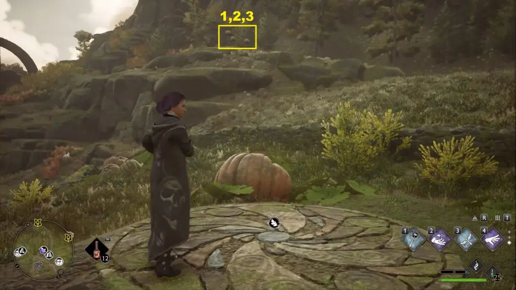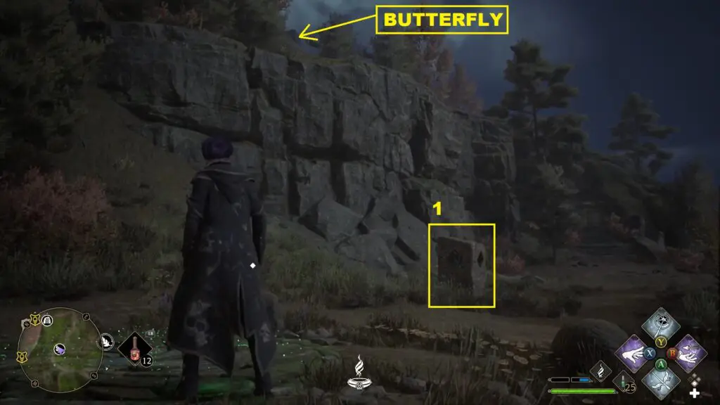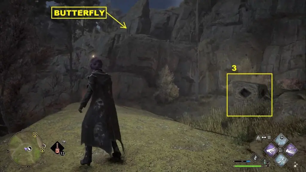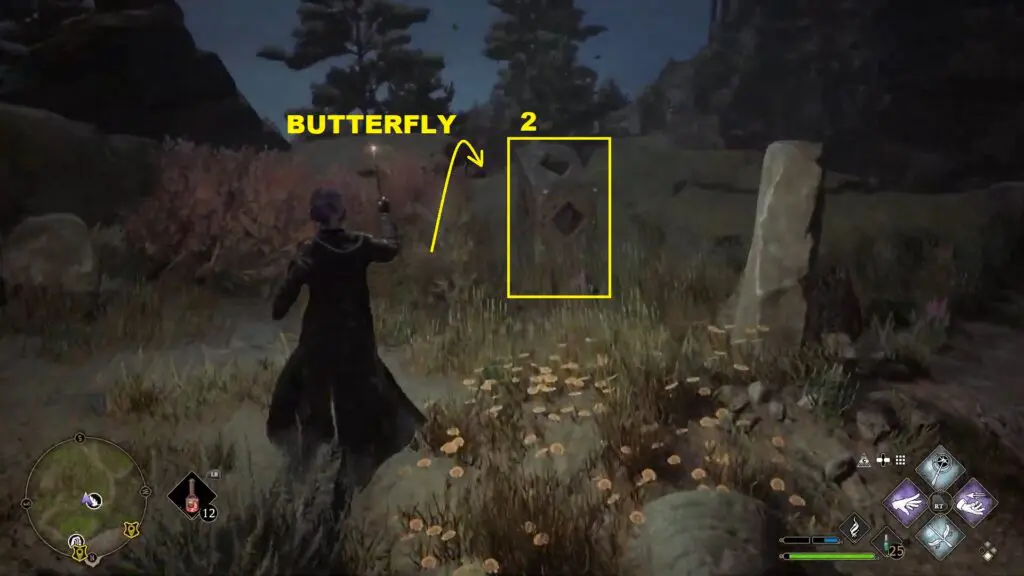 After using the Mallowsweet, three stone pillars with moonlight gems will activate in the area nearby. You will also find clusters of butterflies in the area. Go near the butterflies and use the Lumos spell, which will make them follow you. Take them to the giant stone pillar, which will light it up. Light up the three giant stone pillars to complete the Merlin Trial. All the pillars are near the trial and very easy to spot. All three butterfly clusters are far behind each pillar as shown in the pictures below.