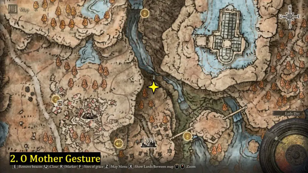 The “O MOTHER” gesture can be found north of Bonny Village near the cliff, in front of a headless statue.