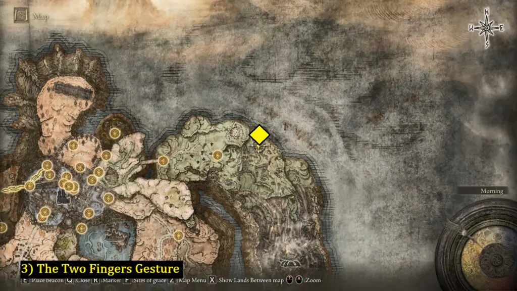 The two-finger gesture is located on the North side of the the DLC map, as shown below. It’s east of Fingerstone Hill Site of Grace
