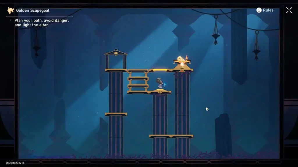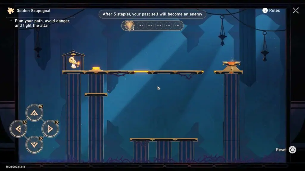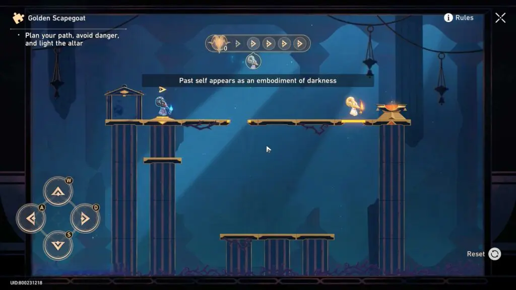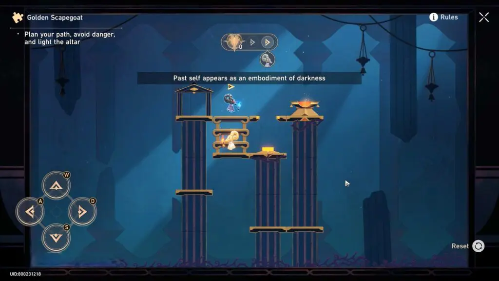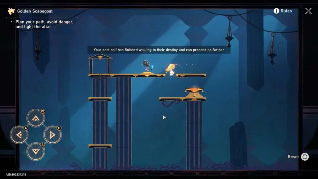To solve the Golden Scapegoat puzzle, follow these steps: Move the Golden Scapegoat in this sequence: Right, Right, Left, Right. This will make your shadow past to step on the pressure button positioned when you are just before the gap.