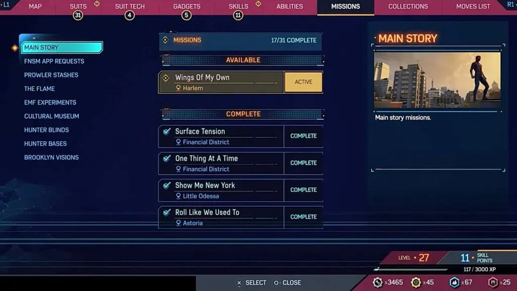 It unlocks after Main Mission 14: Funky. If the mission is not available in your game, that means you need to progress further in the main story. Open the door on the roof of the building as Miles at the location shown in the picture below to start the mission. Go to the museum and scan the puddle of fuel in front of the door. This will start a corruption puzzle. Destroy the red atoms, avoiding the destruction of green atoms to complete the puzzle. This will create a green trail. Follow the trail and it will take you to the museum burglars. Defeat the burglars, investigate the heist truck, and then check the mobile on the crate there.