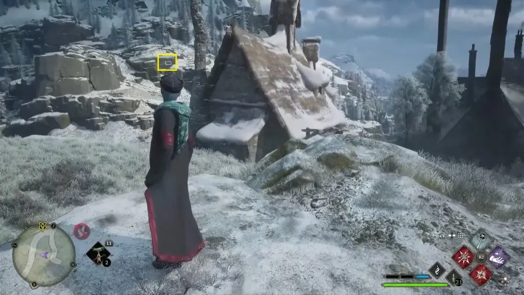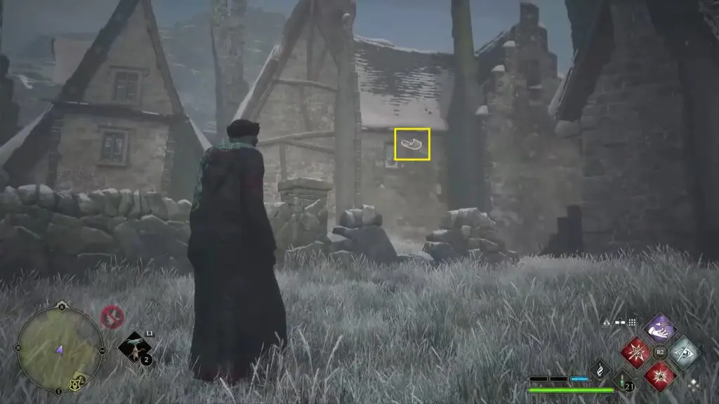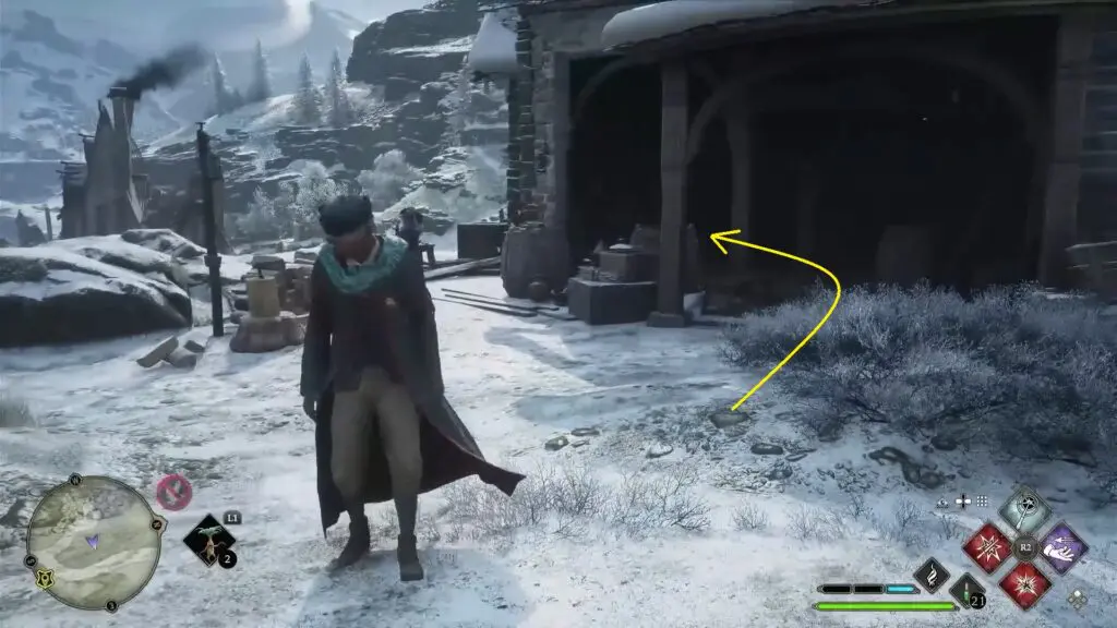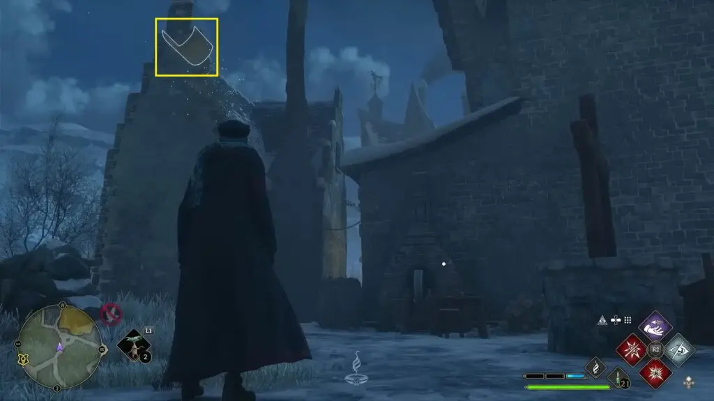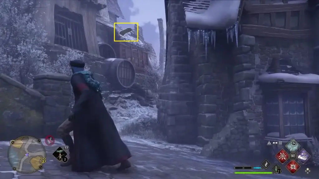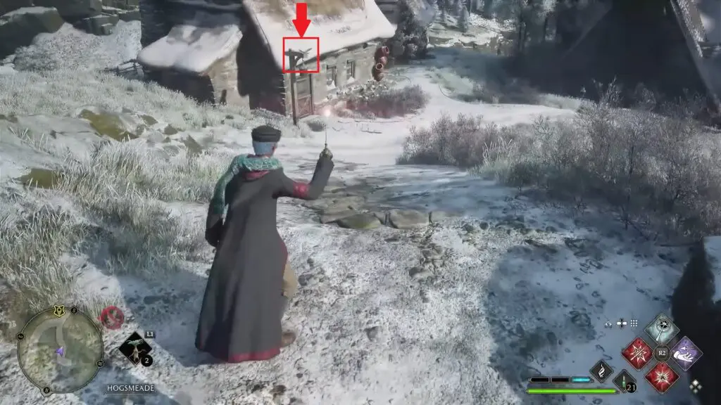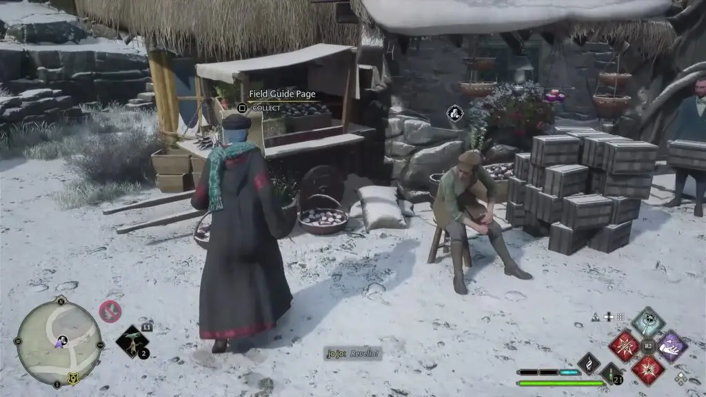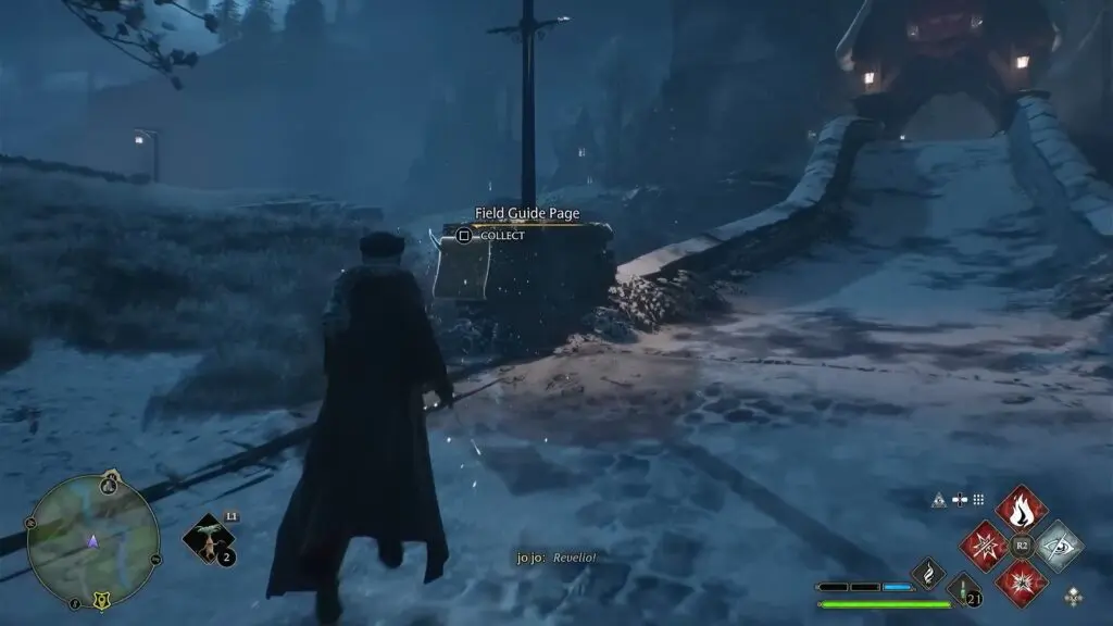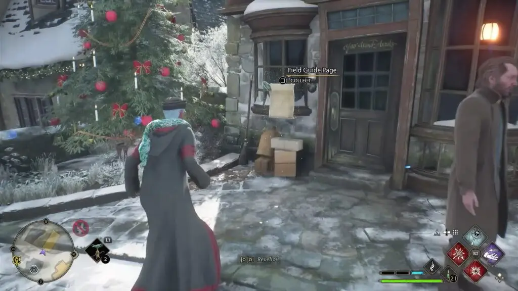 Go through the gap next to the Hog’s Head Inn and use Revelio there to find the Field Guide Page as shown in the picture below.