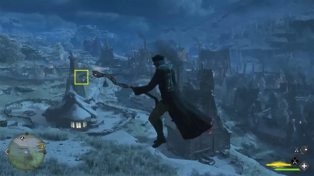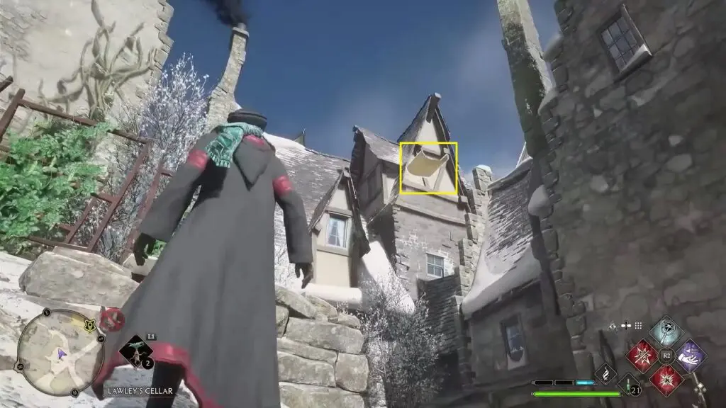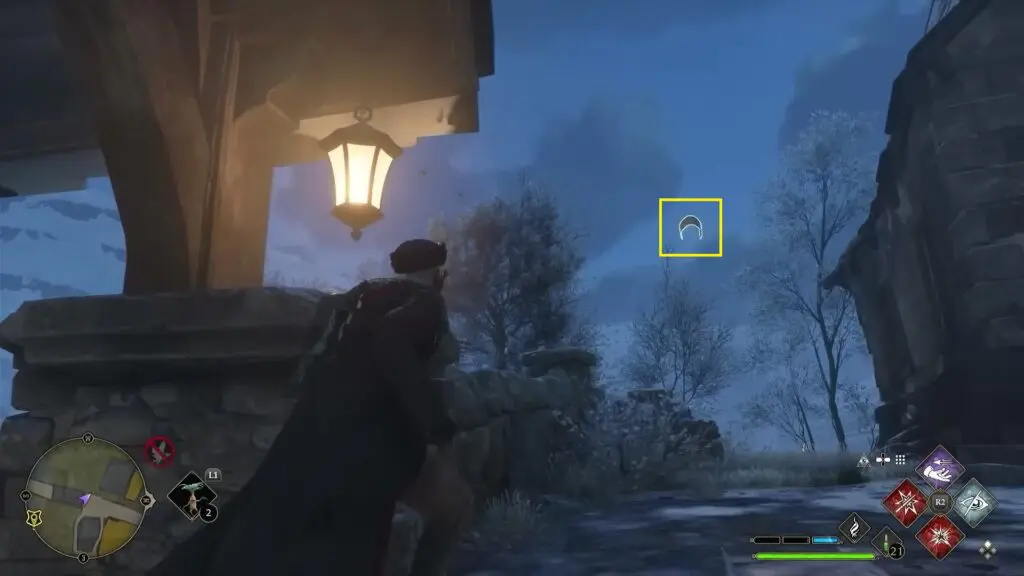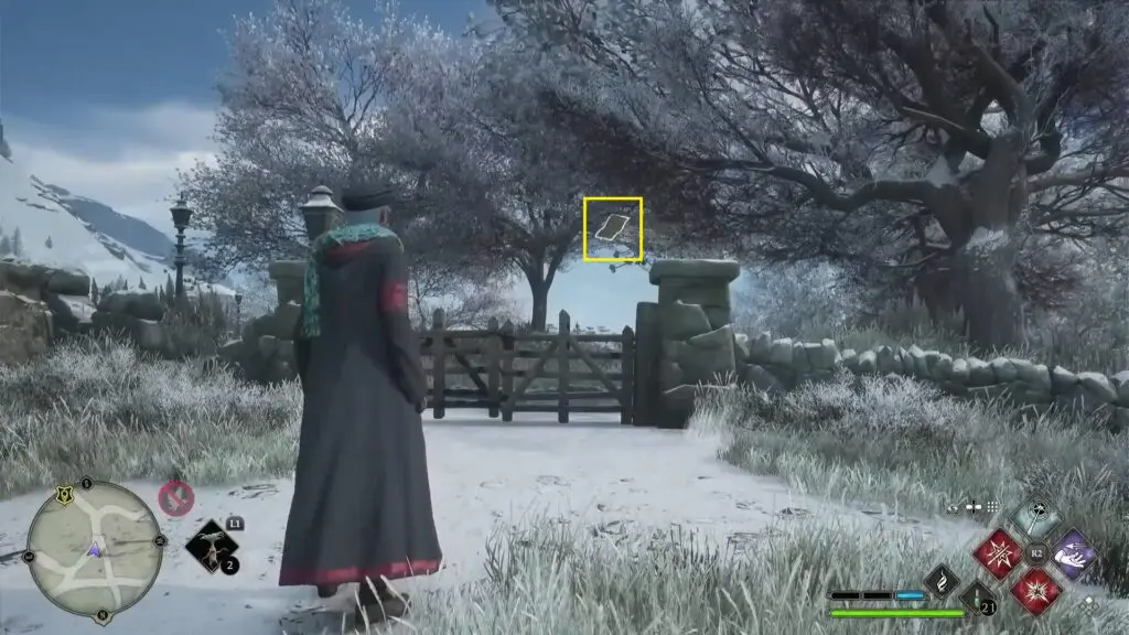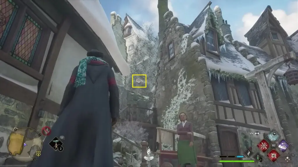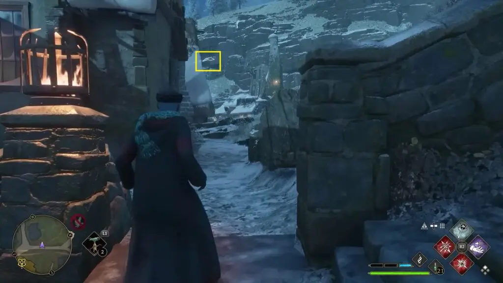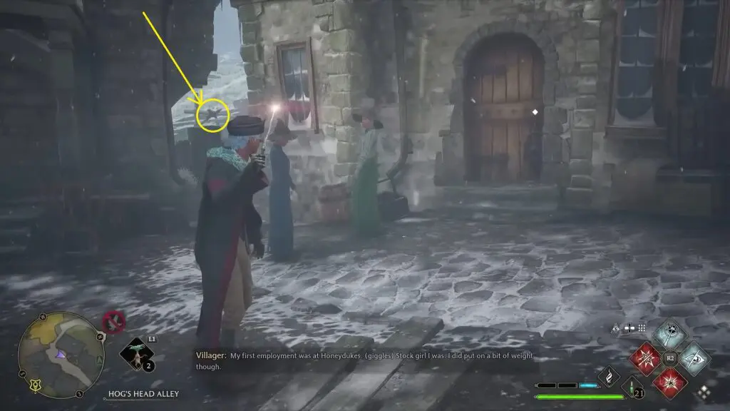 In the same area as the previous Field Guide Page, you will find a painting next to a chest as shown in the picture below. Use Lumos in front of the painting and it will reveal a location. Now jump across the wall opposite the painting. Then turn right to reach Hog’s Head Alley. From there, go through the gap next to the Hog’s Head Inn to reach the location marked in the painting. There you will find a moth as shown in the second picture below. Use Lumos and take the moth back to the painting. This will reveal a Field Guide Page in front of the painting.