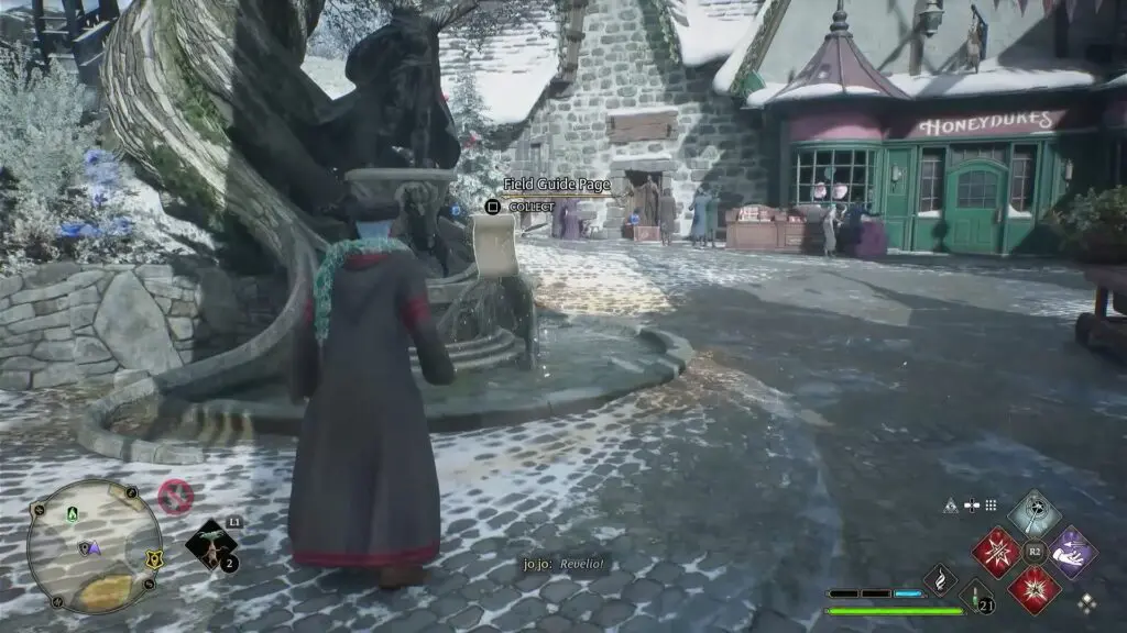 Use Revelio in front of the Honeydukes shop as shown in the picture below to find the Field Guide Page.