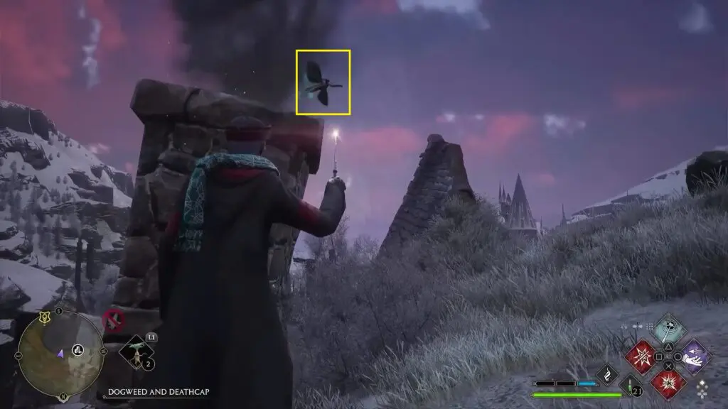 You will find a blank painting inside the Dogweed and Deathcap store. Use Lumos in front of the painting and it will reveal a location. Go out of the store and climb up the rocks next to the store to reach the chimney. You will find the moth on this chimney as shown in the picture below. Use Lumos to take the moth to the painting. This will give you the Field Guide Page.