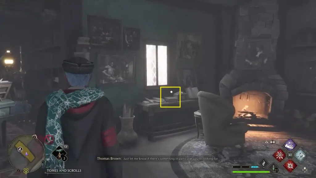 Enter The Three Broomsticks. Then go straight ahead and use Revelio in front of the fireplace to get this one.