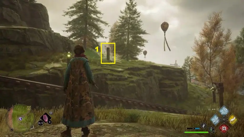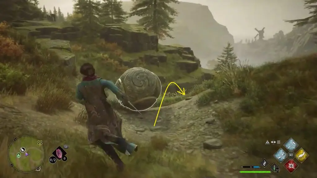 The second cluster of balls is up the hill on the south side of the trial as shown in the picture below. Use the Wingardium Leviosa spell on the stones and guide them to the holes as shown in the picture below.