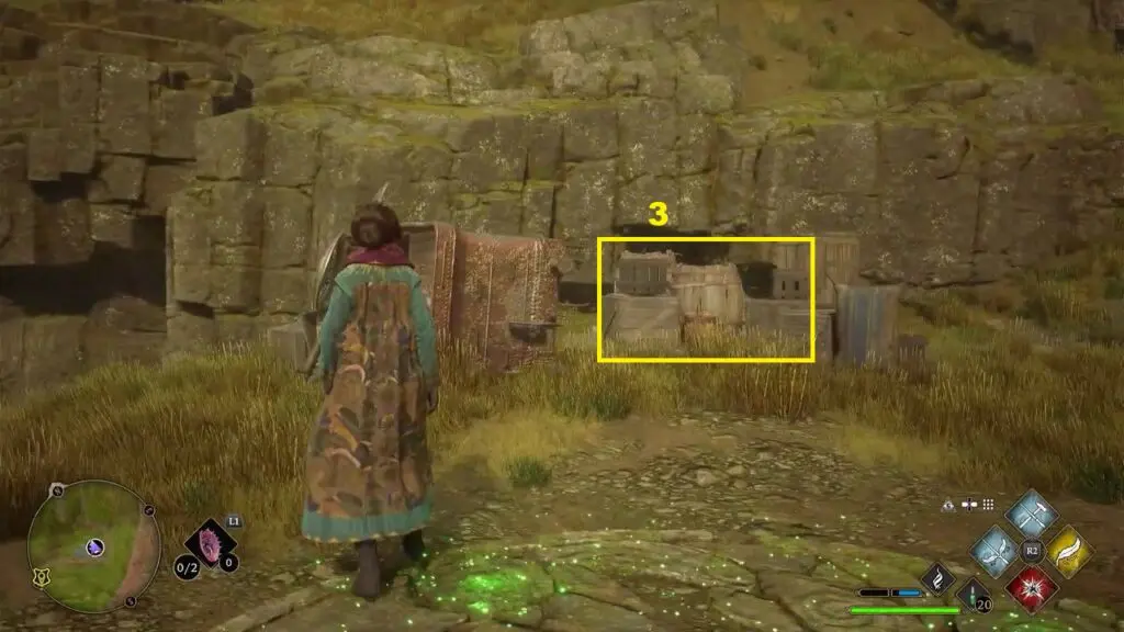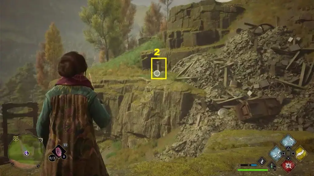 After using the Mallowsweet, three statues will break down. You need to use the Reparo spell and repair these three statutes to complete the trial. The first statue is on edge of the hill on the east side of the trial. The second statue is in front of the mountain wall on the south side of the trial. The third statue is under the tent on the west side of the trial. The location of all the broken statues is shown in the pictures below.