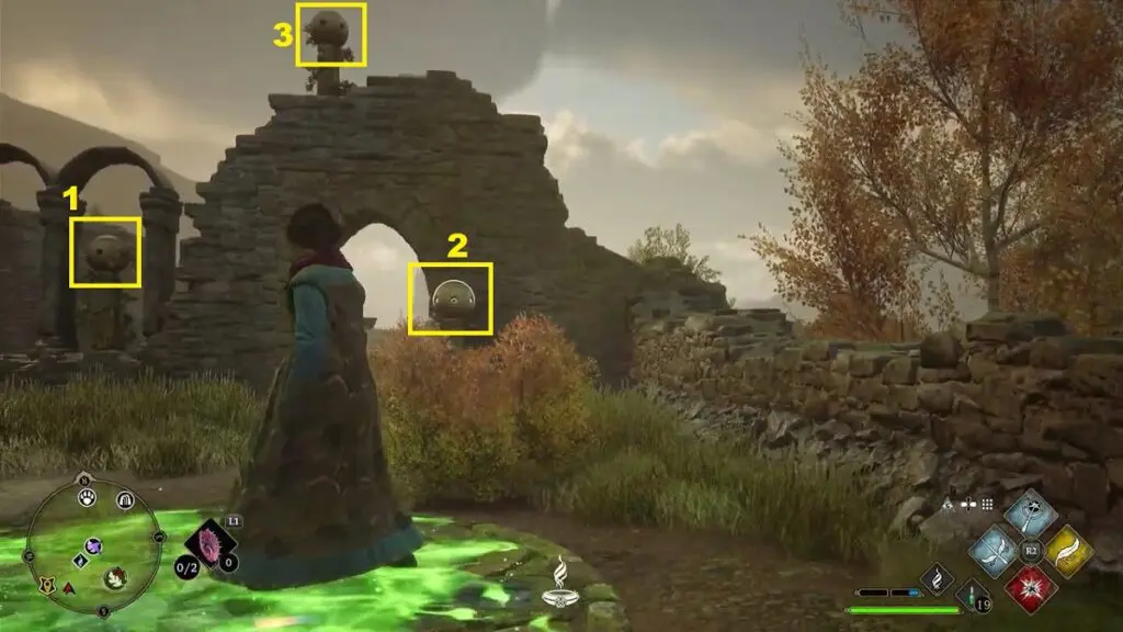 To complete the trail, you need to destroy nine small balls on top of pillars. Two balls are on the west side of the Merlin Trial as shown in the picture below. Three balls are on the east side of the Merlin Trial as shown in the second picture below. One of the balls is behind the rock (Marked as ‘5’ in the picture below). Three are on the south side as shown in the third picture below. One ball is on the north side as shown in the fourth picture below. Destroying all nine balls completes the trial.