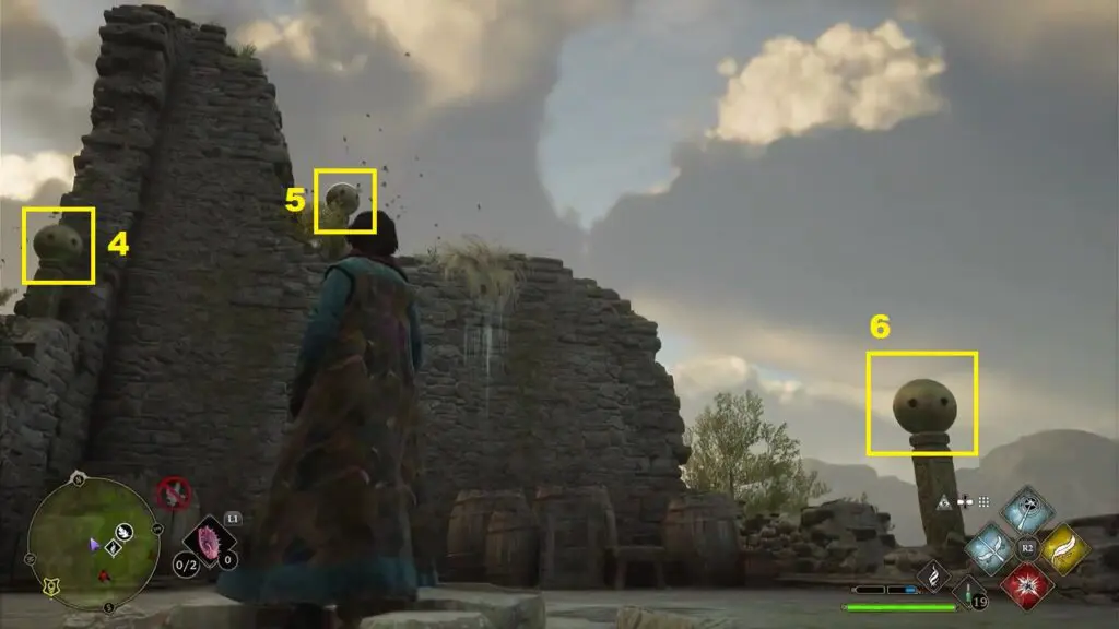 Now climb up the stairs on the west side. Use the Accio spell on the stones and guide them to the holes as shown in the picture below.