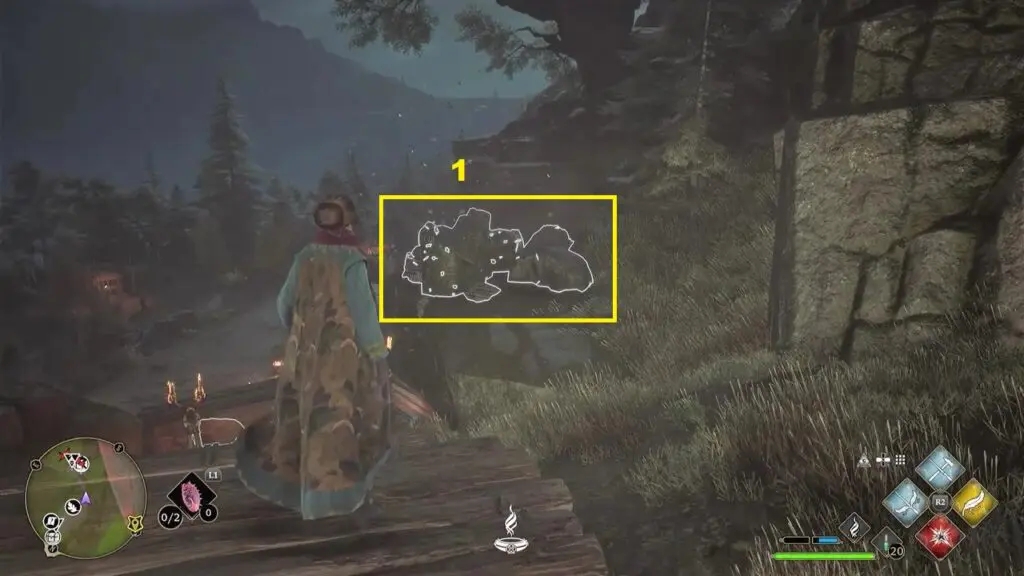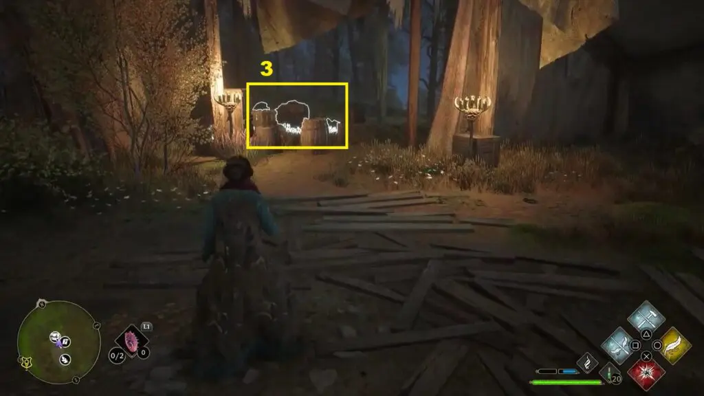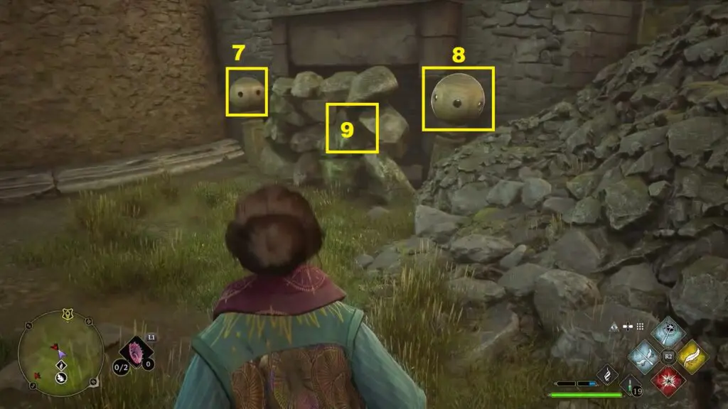 Go to the east side of the camp and you will find the holes next to the eastern wall of the camp. Go a little further east and burn the vines as shown in the picture below. This will reveal the stones hidden behind them. Now use the Accio spell on the stones and guide them to the holes next to the eastern wall of the camp as shown in the second picture below. This will complete the trial.