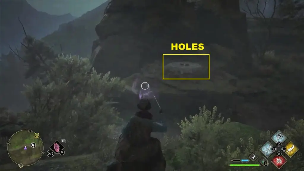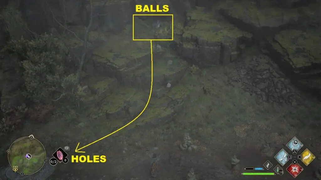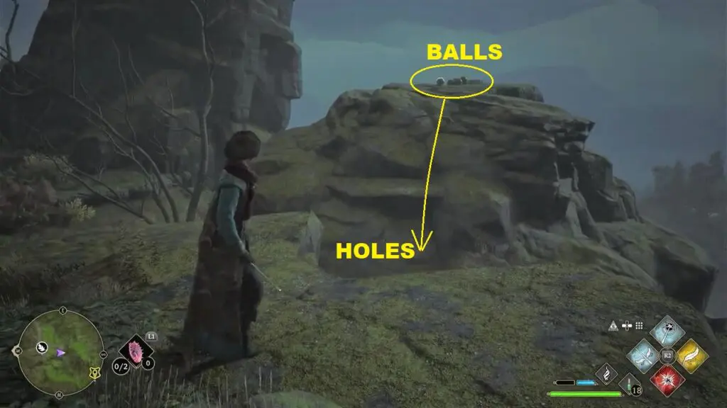 On the north side of the trial location, you will find the balls behind some rocks as shown in the picture below. Then use the Wingardium Leviosa spell on the stones and guide them to the holes as shown in the picture below.