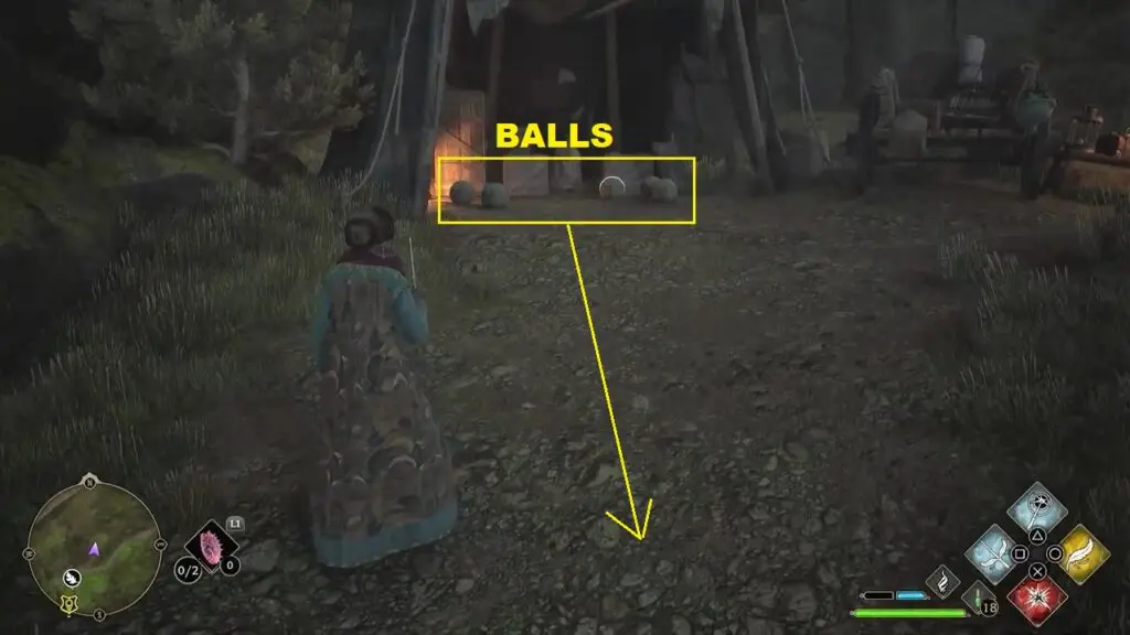Fly up the hill on the northeast side of the trial location, and you will find the balls in a small tent as shown in the picture below. Then use the Wingardium Leviosa spell on the stones and guide them south to the hole as shown in the second picture below.