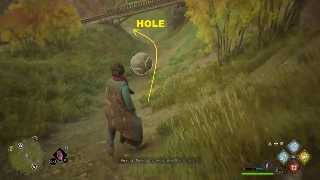 After starting the trial, go west to reach a giant stone ball. Use Depulso spell on the giant stone ball to move it over the fence through the wooden ramp behind it as shown in the picture below. Then use the Depulso spell to guide the giant ball across the bridge and drop it into the hole as shown in the second picture below. This will complete the trial.