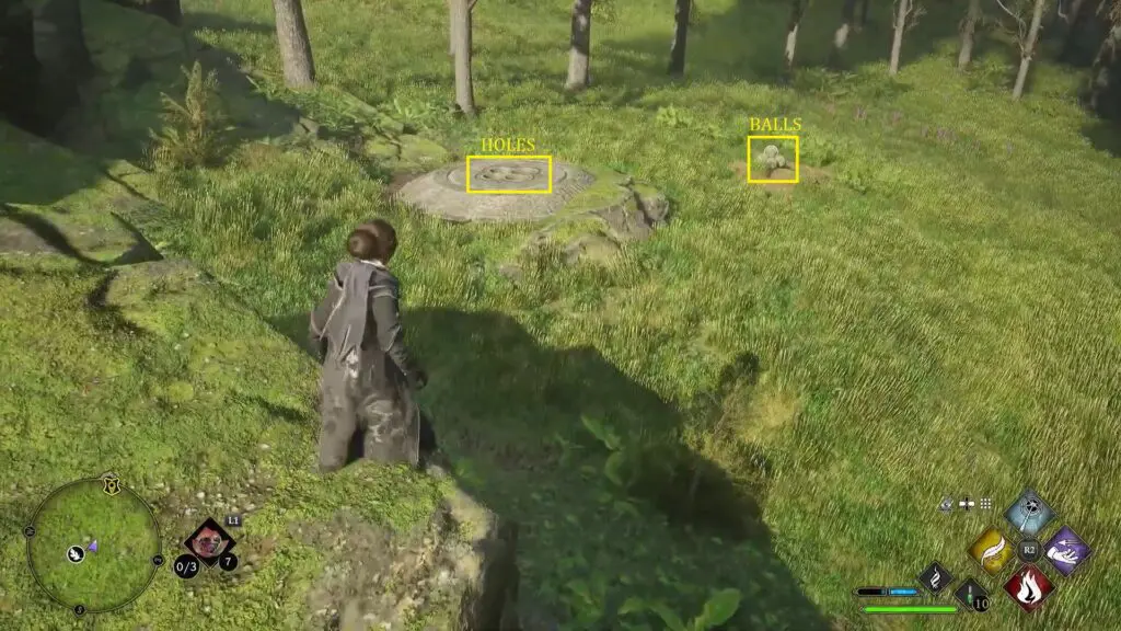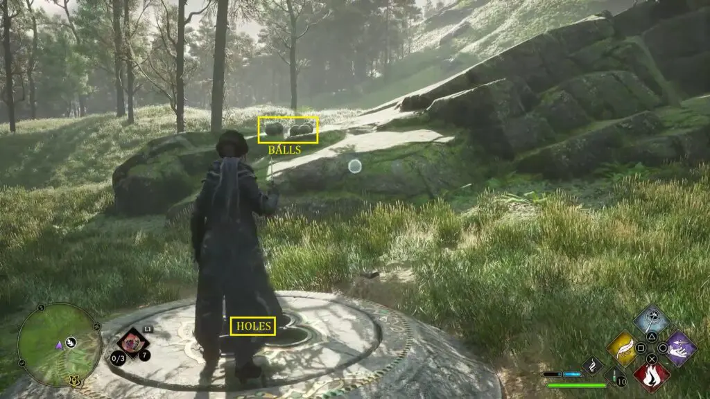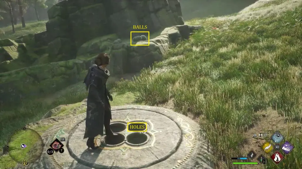 To solve the puzzle, you need to move the ball into the giant hole in the ground near the river as shown in the second picture below. First, use Leviosa spell to lift the giant stone ball in the air as shown in the picture below. Then move towards the hole and use the Accio spell to summon the giant stone towards you. Now guide the giant stone into the hole while using Accio. The trial completes when the giant stone ball drops into the hole.