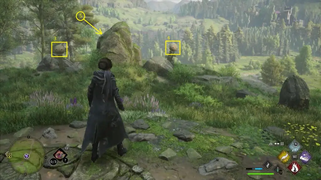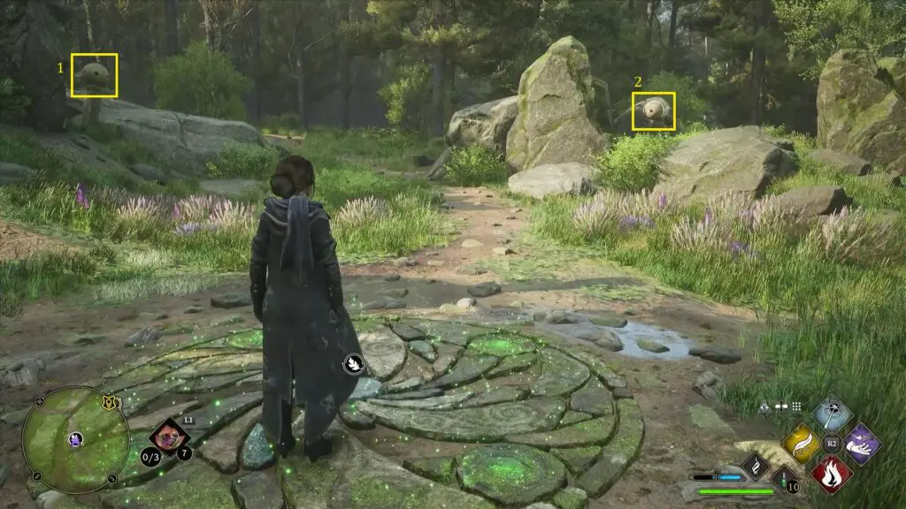 Go to the south side of the camp and burn the vines as shown in the picture below. This will reveal the stones hidden behind them. Now use the Accio spell on the stones and guide them to the holes next to the southern wall of the camp as shown in the second picture below. This will complete the trial.