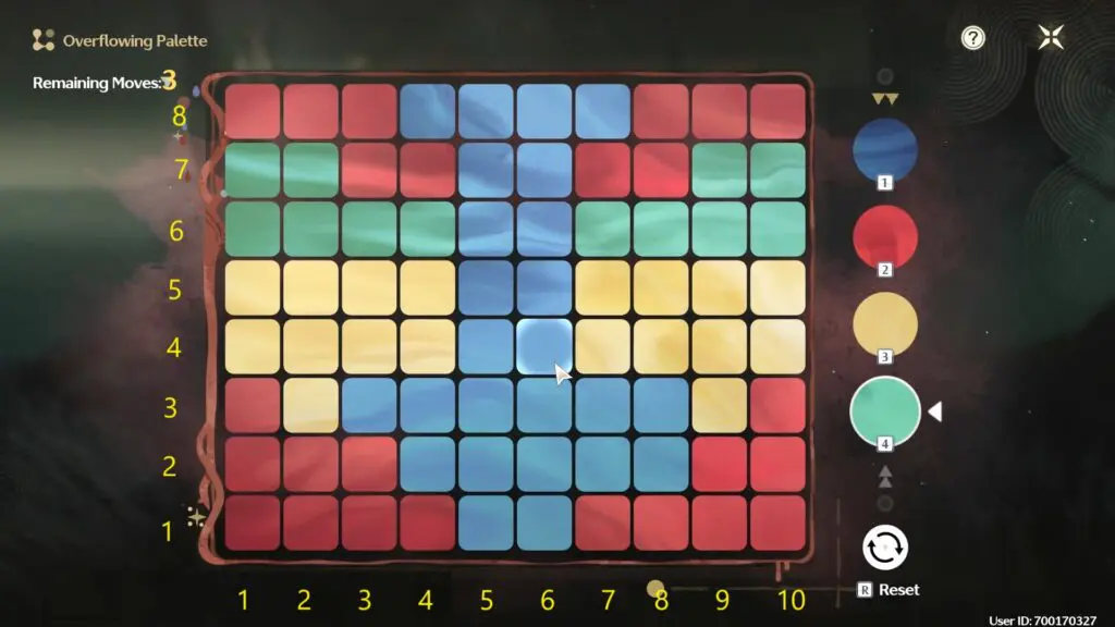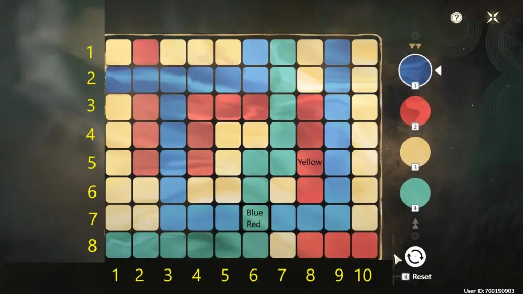 To begin the puzzle, interact with the spiraling painting. The player has three moves to turn the entire palette yellow and solve the puzzle. To solve the first puzzle press the block colors and positions in the given order.
