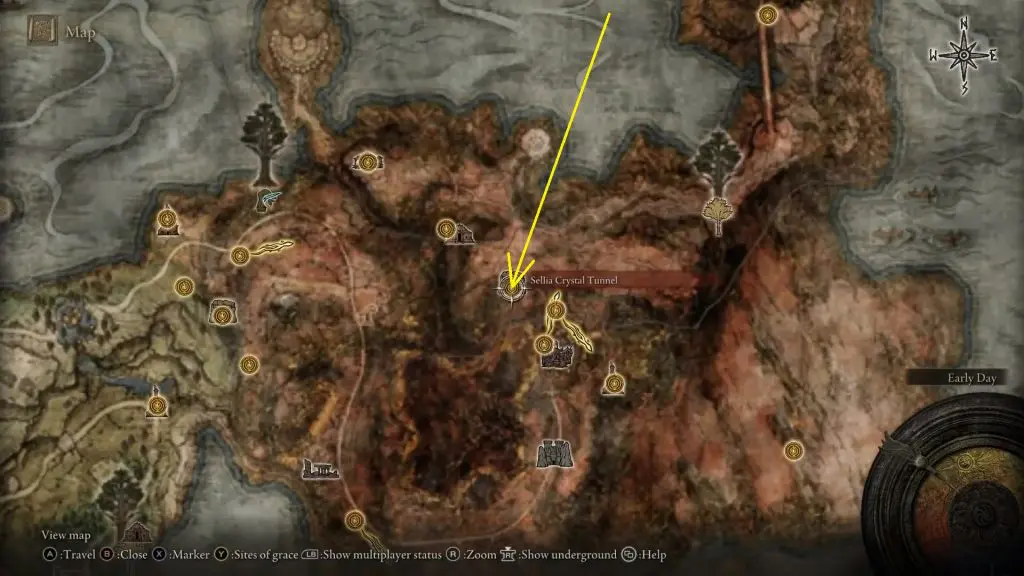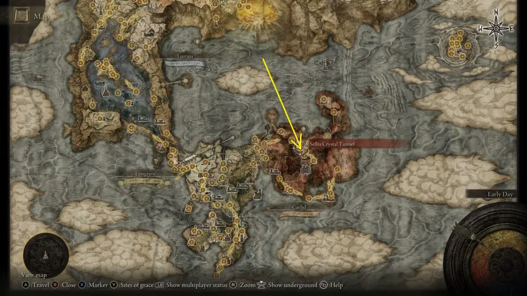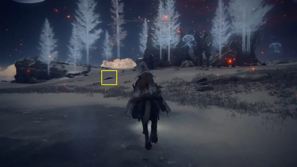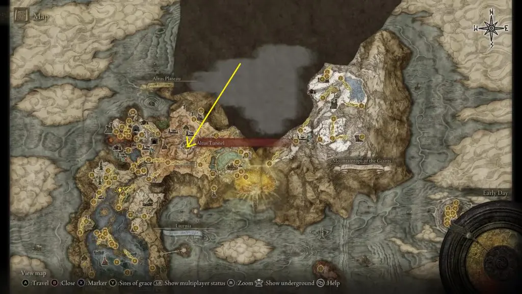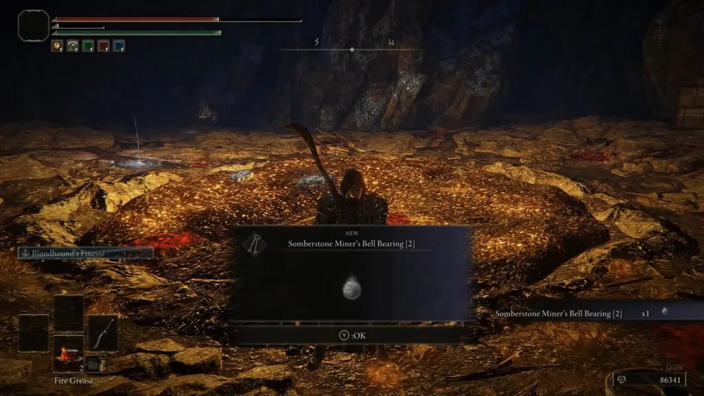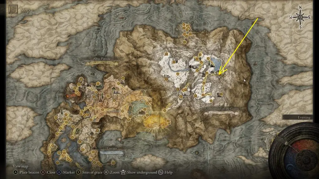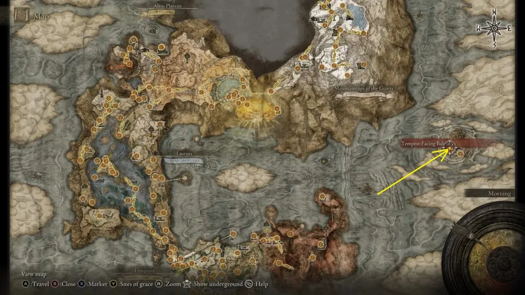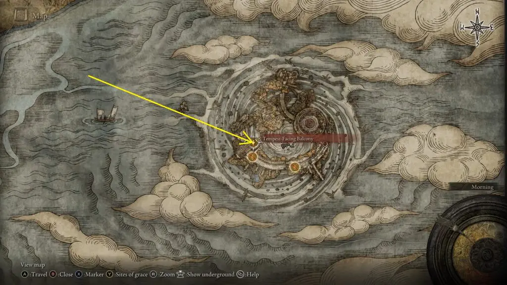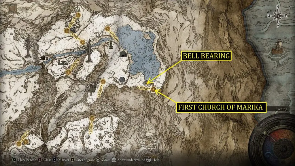 You cannot get Somberstone Miner’s Bell Bearing [4] until a very later stage in the game. First, you will have to defeat the Fire Giant Boss, who is in the snowy area on the northeastern part of the map. This will unlock the small island on the right side. Go to the Tempest-Facing Balcony Site of Grace on this island. you will find Somberstone Miner’s Bell Bearing [4] near this Site of Grace as shown in the pictures below.
