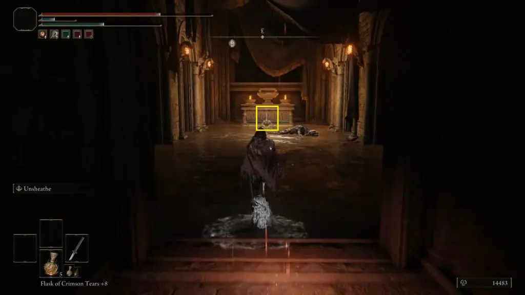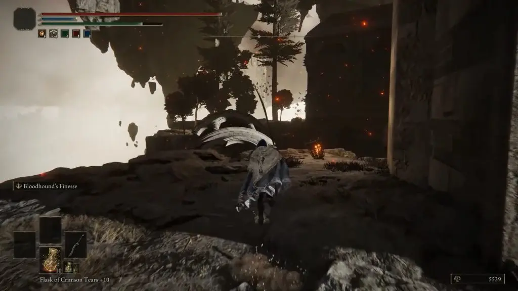 In Crumbling Farum Azula, you need to go to the location marked in the picture below. From the Godskin Duo boss, get out from the north door and keep progressing until you reach a dragon casting red lightning. From there, turn right and you will reach the area marked in the pictures below. Use the fallen building to cross the path and then enter the building on the right side. Here you will find the Somberstone Miner’s Bell Bearing [5] on a corpse as shown in the third picture below.
